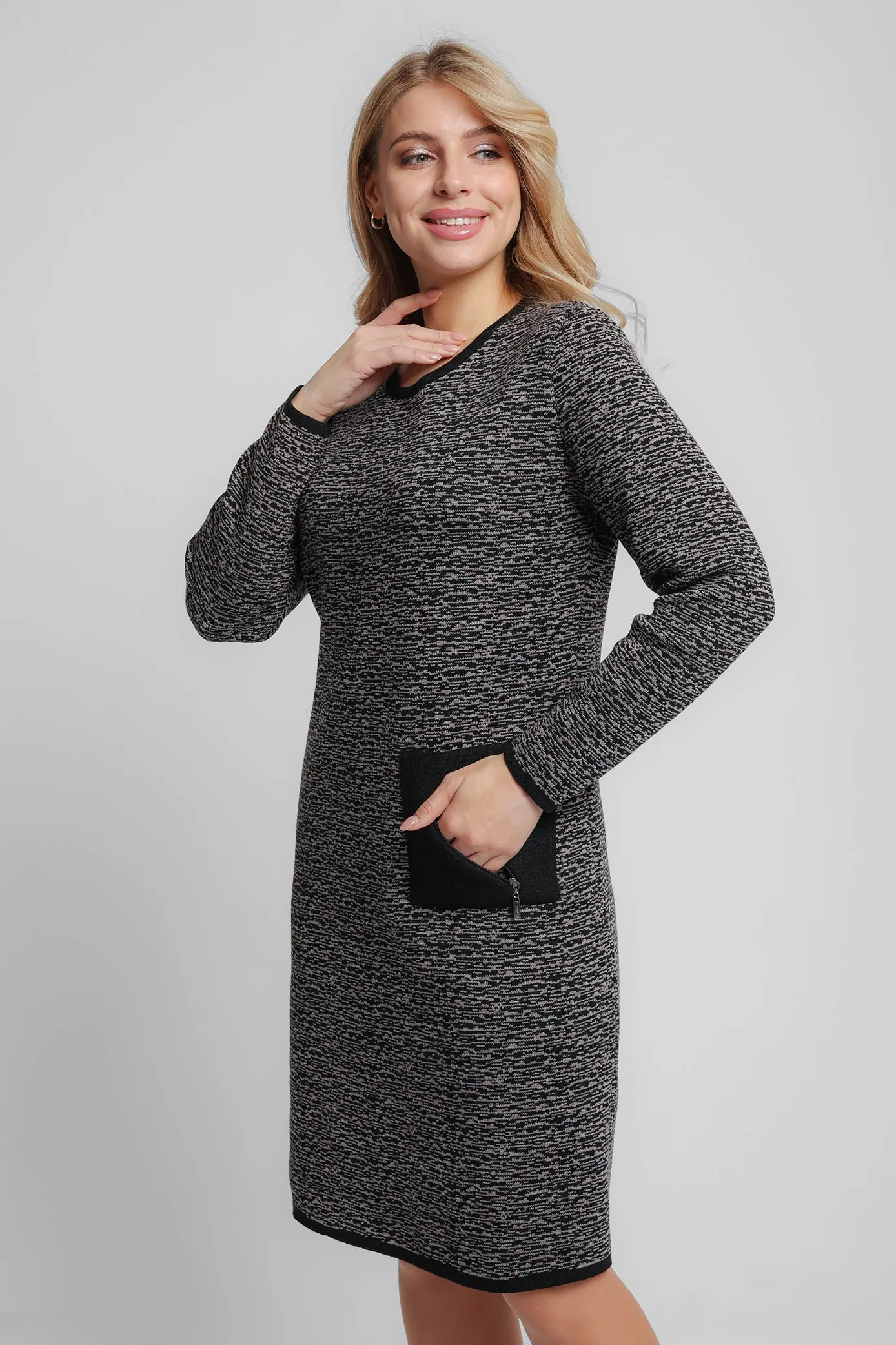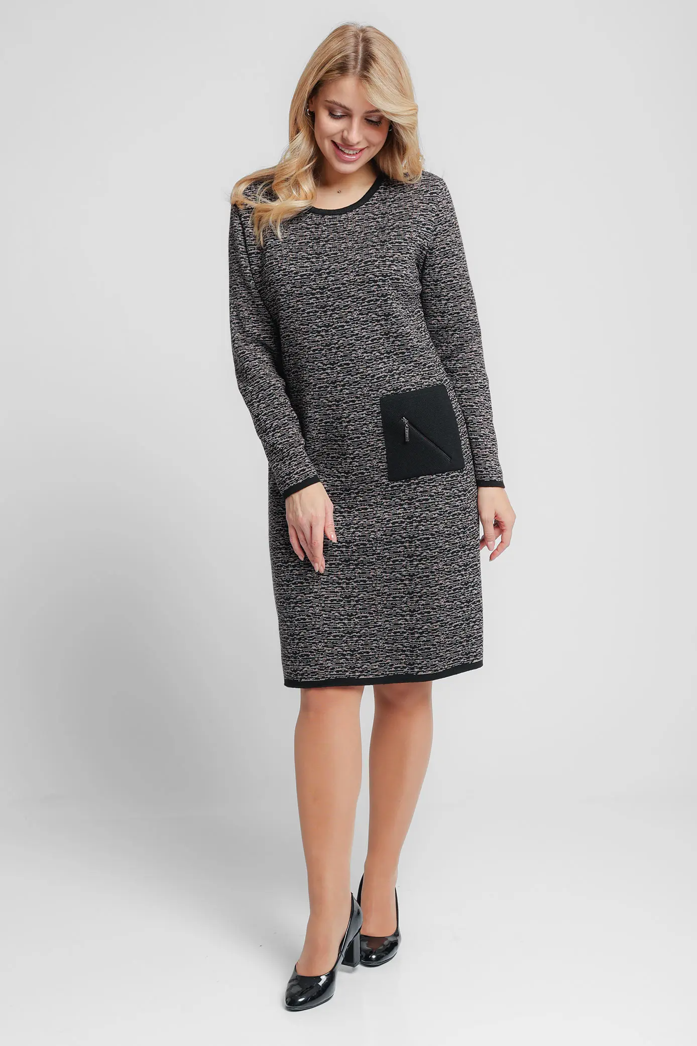 Вязаное платье женское полуприлегающего силуэта с круглой горловиной длиной до колена. Рукава втачные длинные.  Накладной карман с диагональной молнией. Жаккардовое переплетение. Платье вязанное из полушерстяной пряжи и подходит для использования в зимний период. капучино