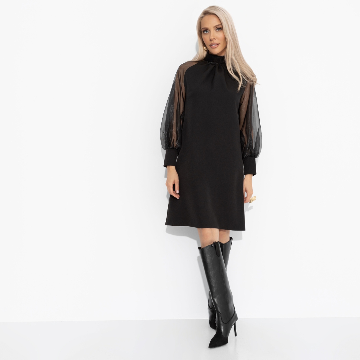 Воплощение вечной элегантности Коко Шанель от ЧАРУТТИ. Идеальный силуэт как симфония безупречного вкуса и сдержанной чувственности. Органза на рукавах добавляет шлейф тайны, напоминая о парижских вечерах, где каждая деталь — намёк на изысканность. Она не просто одета, она облачена в наследие, которое никогда не выйдет из моды. Платье трапециевидного силуэта в длине до колена. Длинные рукава сделаны из тонкой органзы в тон изделия. Платье хорошо смотрится на любом типе фигуры. Воротник-стойка, сзади оформлен бантом из органзы.