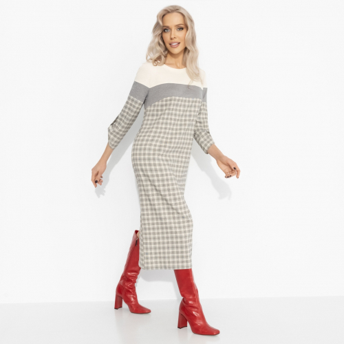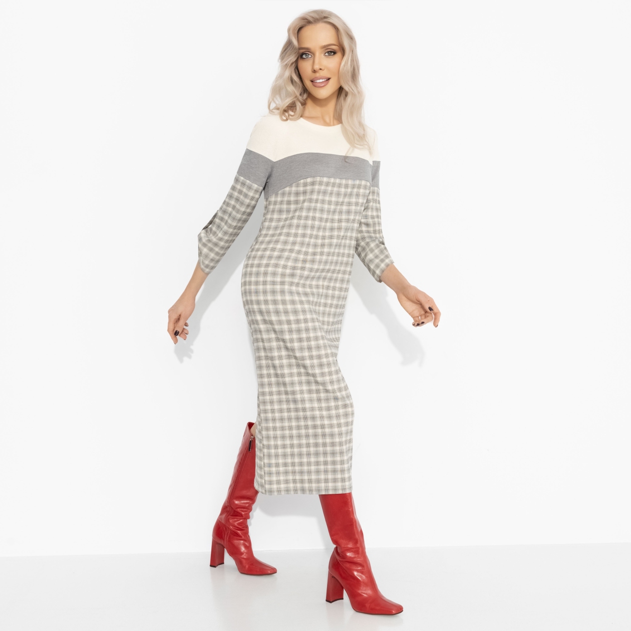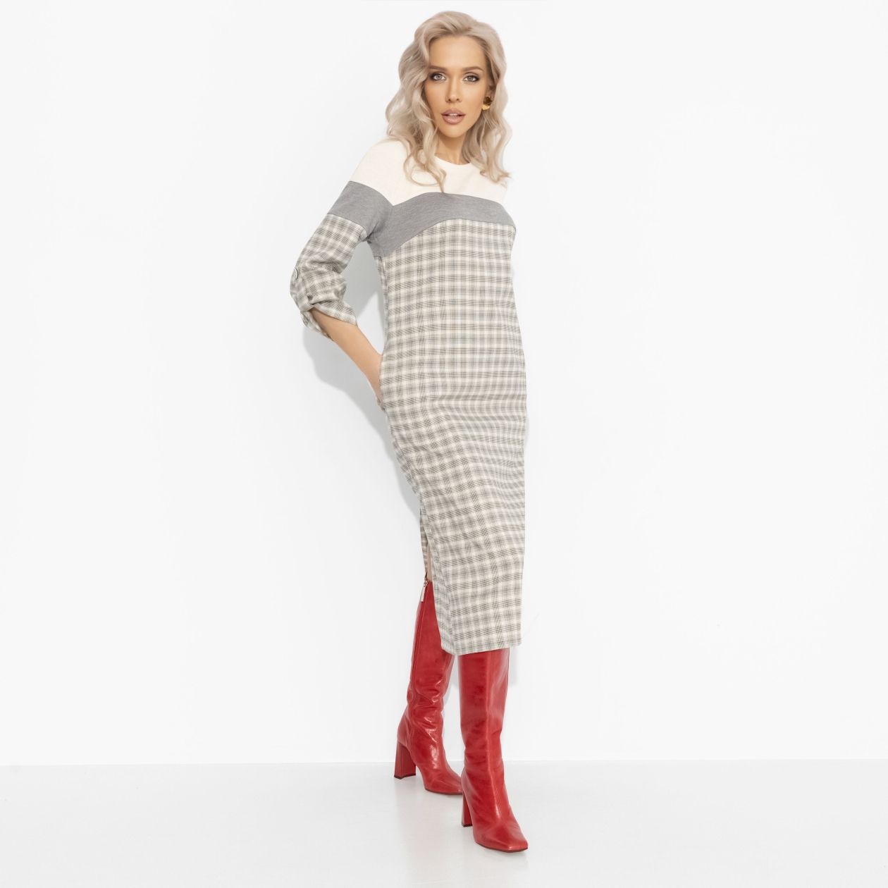 Для тех дней, когда хочется не доказывать, а просто быть. Мягкая клетка, спокойные серо-бежевые тона и расслабленный силуэт как будто шепчут: «сегодня твой главный план – нравиться себе». Добавьте яркие сапоги или помаду, и минималистичный образ превращается в оду внутренней гармонии. Платье миди прямого и очень женственного кроя. Визуально вытягивает силуэт и комфортно садится на разные типы фигур. Контрастные однотонные вставки в верхней части балансиируют клетку и освежают тон кожи. Изделие с карманами и акцентными декоративными пуковицами по спинке.