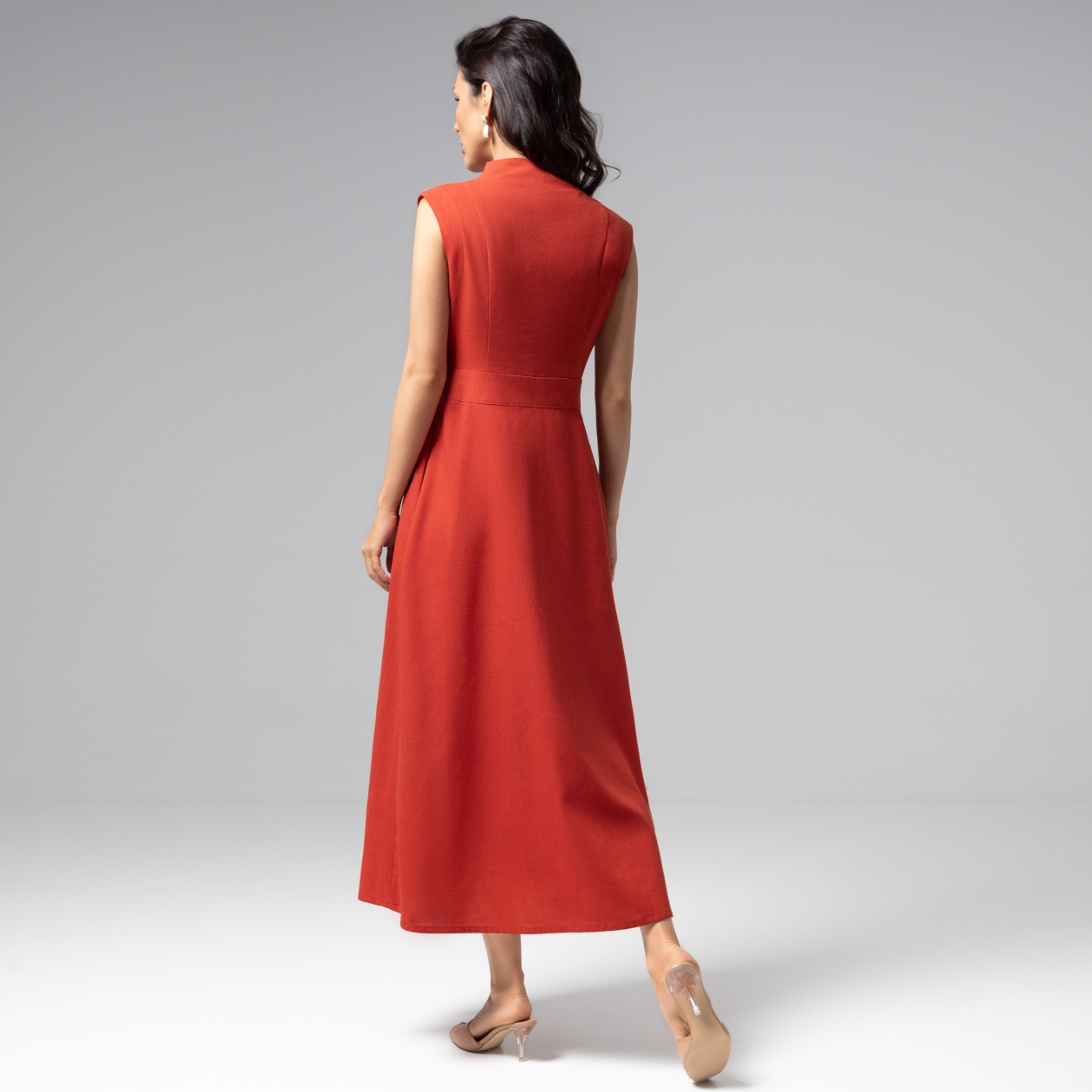 Платье из коллекции PREMIUM – квинтэссенция средиземноморской эстетики, где каждая складка дышит роскошью. Изысканный силуэт платья ЧАРУТТИ воплощает безупречный баланс женственности и лаконичности. Приталенный крой с запахом мягко подчеркивает талию. Элегантная драпировка струится по фигуре. Платье изготовлено из люксовой смесовой ткани. Хлопок дарит изделию невесомую мягкость, а лён добавляет благородную структуру и идеальную формоустойчивость даже после длительного ношения. Терракотовый оттенок напоминает отблеск заката на средиземноморской керамике. Особый метод окрашивания ткани гарантирует сохранение цвета после множества стирок. Платье асимметричного кроя на запах. Есть карманы.