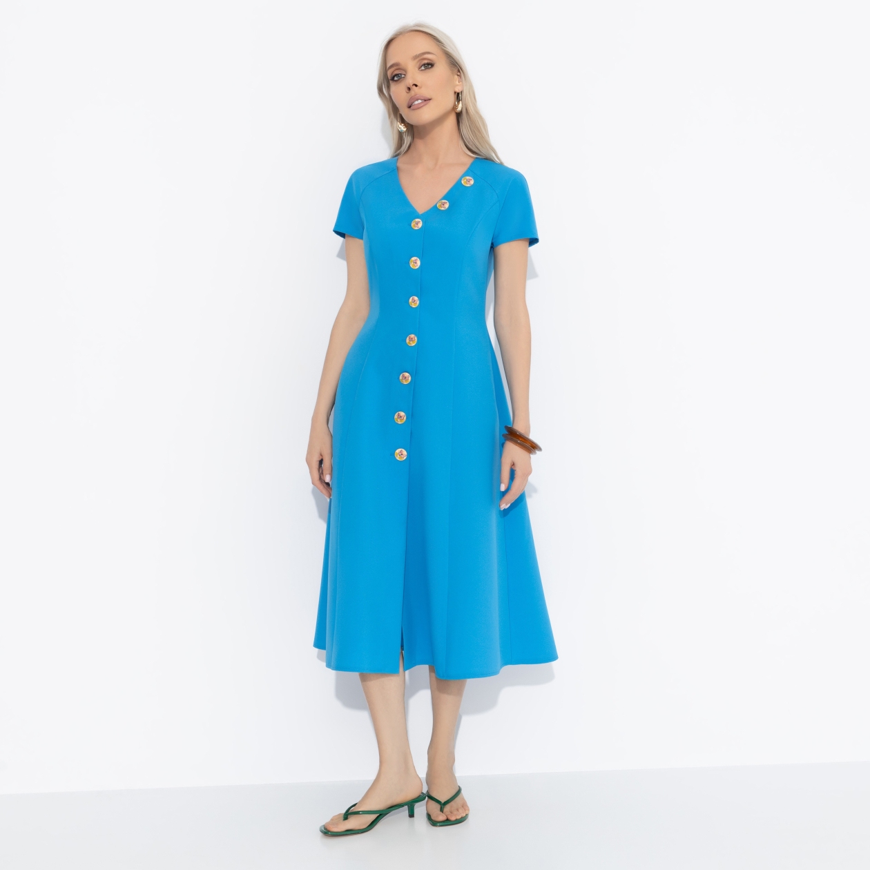 Платье CHARUTTI выглядит, как приглашение пойти на свидание. Женственное и элегантное, оно характеризует вас как порядочную и статную особу. Образ CHARUTTI, в который влюбляешься. Платье приталенного силуэта в длине миди. Акцентные пуговицы изделия. Есть деликатный разрез спереди по линии пуговиц. Платье с карманами.