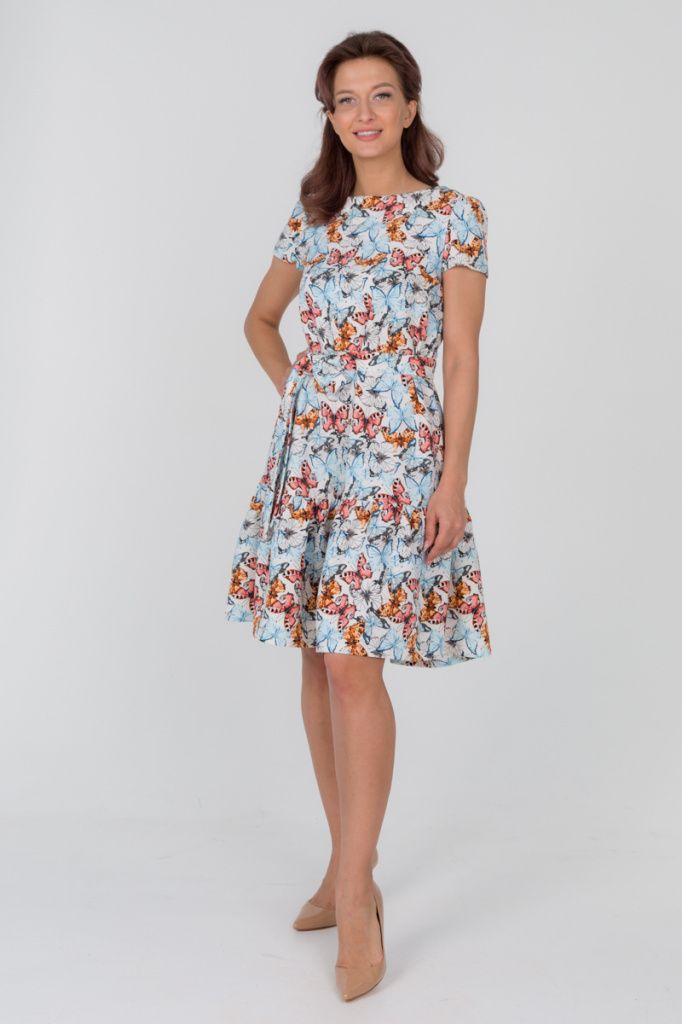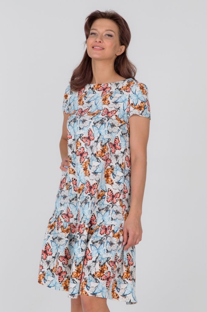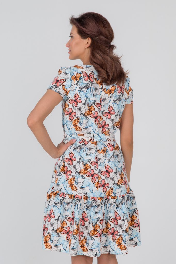 Платье с коротким рукавом и притачным воланом по низу, застегивается на молнию в среднем шве спинки. Пояс в комплекте.