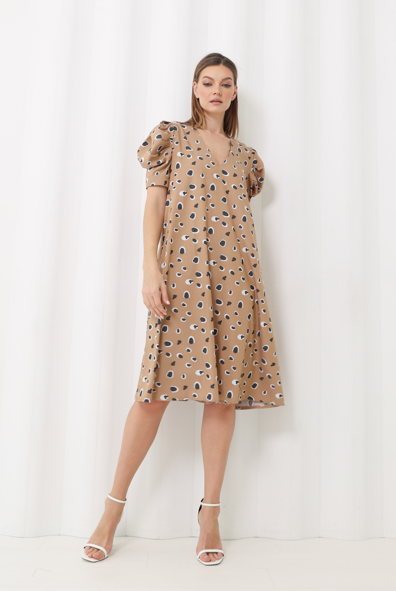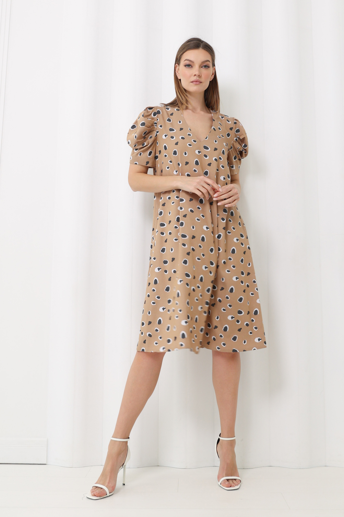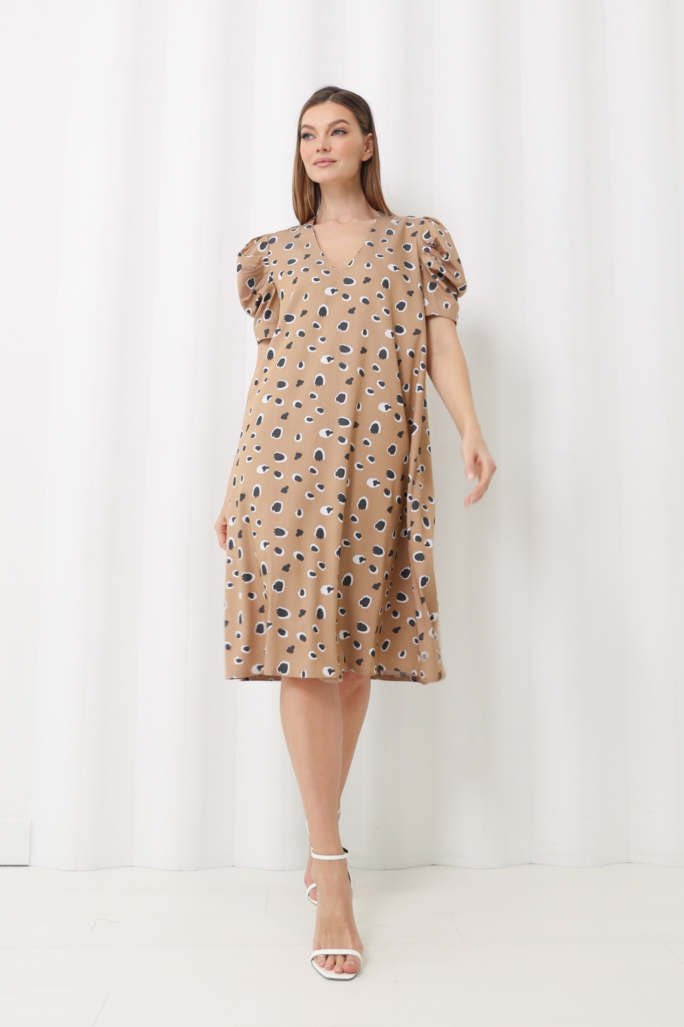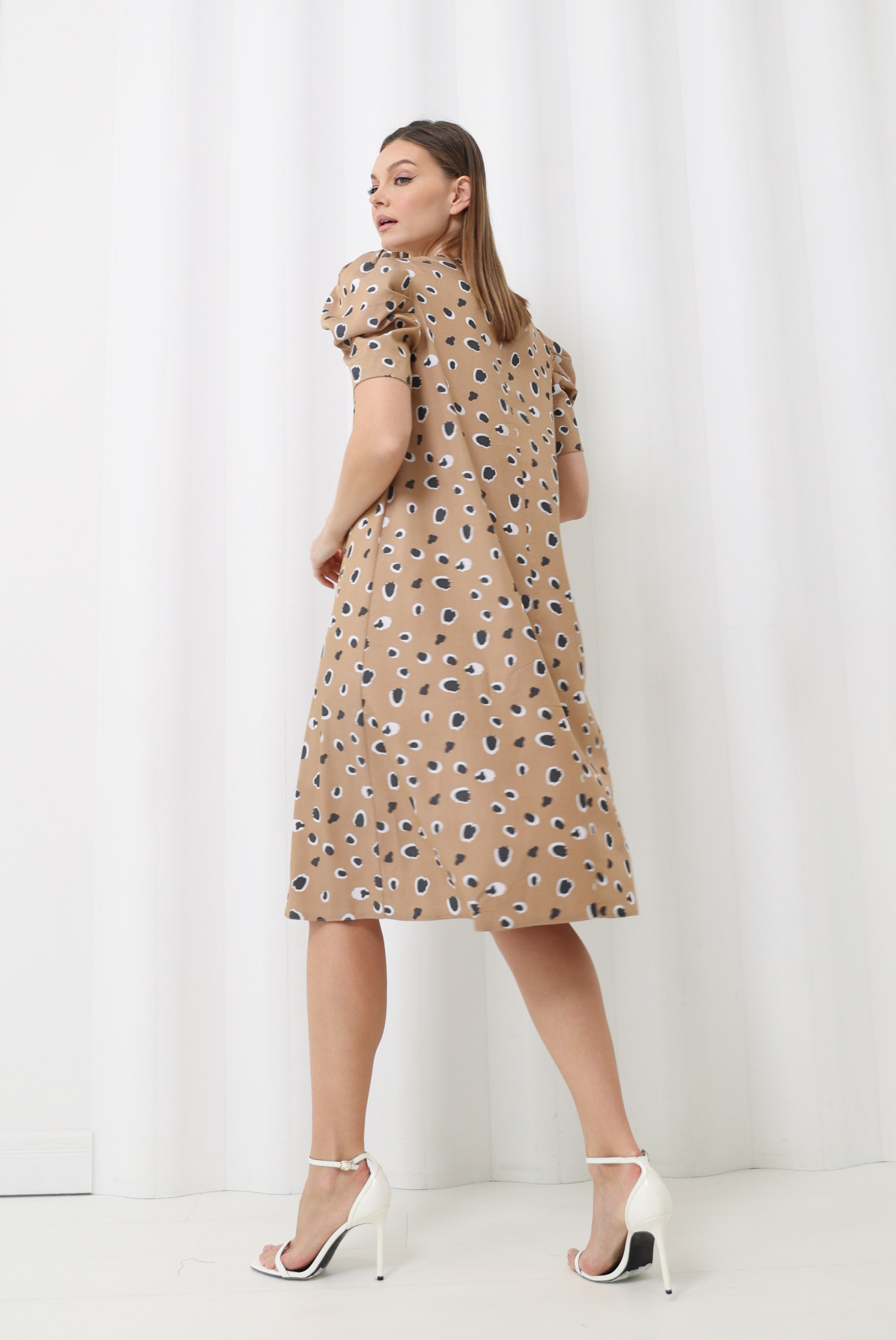 Платье миди А-силуэта. Втачные рукава-буфы, V-вырез горловины, средний шов спинки.