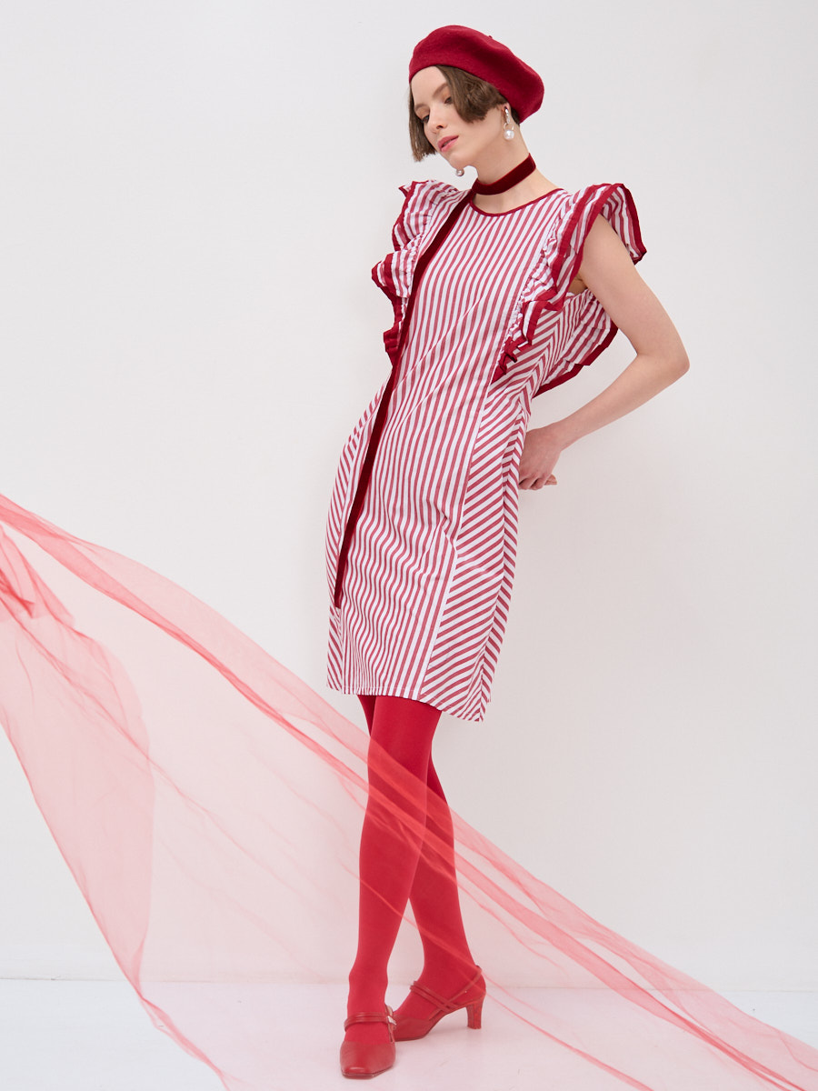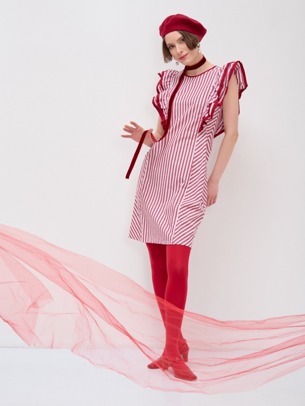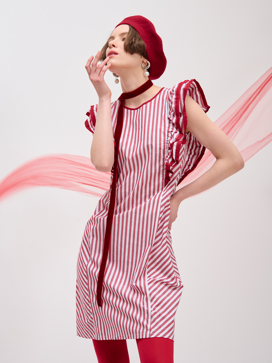 Представляем стильное платье, разработанное для успешной реализации в вашем бутике или шоуруме. Эта модель идеально сочетает в себе комфорт повседневной одежды и изысканные дизайнерские акценты, обеспечивая высокий спрос среди вашей целевой аудитории.Особенности модели:Силуэт: Трапециевидный силуэт с отрезным бочком создает свободную, но при этом женственную форму, подходящую для различных типов фигур. Длина выше колена придает образу легкость и актуальность.Рукав: Двухслойный рукав-«крыло» с пышными рюшами является ключевым акцентом платья. Он добавляет объем и динамику, делая модель выразительной и запоминающейся.Детализация: Горловина и края рукавов отделаны контрастной косой бейкой, подчеркивающей чистоту линий и внимание к деталям. Вертикальный полосатый принт визуально вытягивает силуэт.Универсальность: Платье идеально подходит как для повседневного ношения, так и для создания более торжественных образов в зависимости от аксессуаров.Каждая деталь этого платья, от высококачественных лекал до выбора тканей, продумана для обеспечения превосходной посадки и долговечности. Инвестируйте в модели, которые гарантированно станут бестселлерами и повысят лояльность ваших клиентов.Уход: Машинная деликатная стирка.