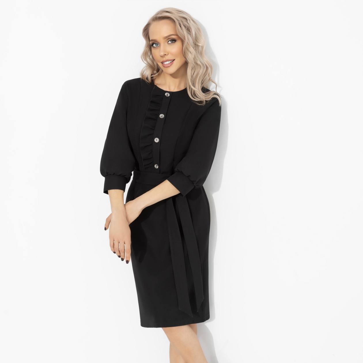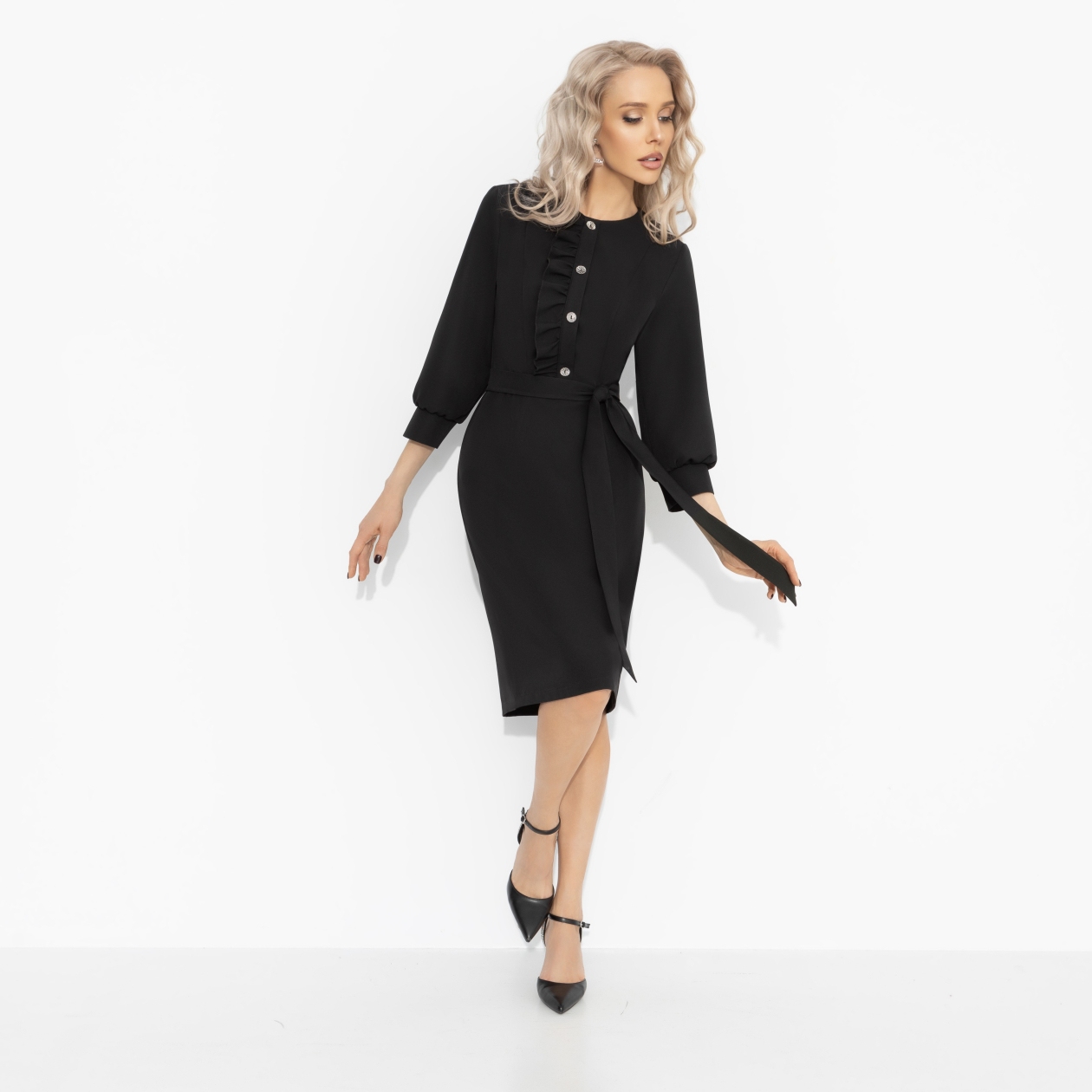 Ты красотка в этом платье! Пронзительный черный цвет в стиле героинь парижских драм, мягкий силуэт, акцентные рюши и блеск пуговиц делают образ идеальным и для офиса, и для ужина при свечах. Полуприлегающий силуэт платья со съемным поясом подчеркивает талию и визуально стройнит. Рукав 3/4 на мягкой манжете, застежка на декоративные пуговицы. Вертикальная рюша по центру вытягивает силуэт.
