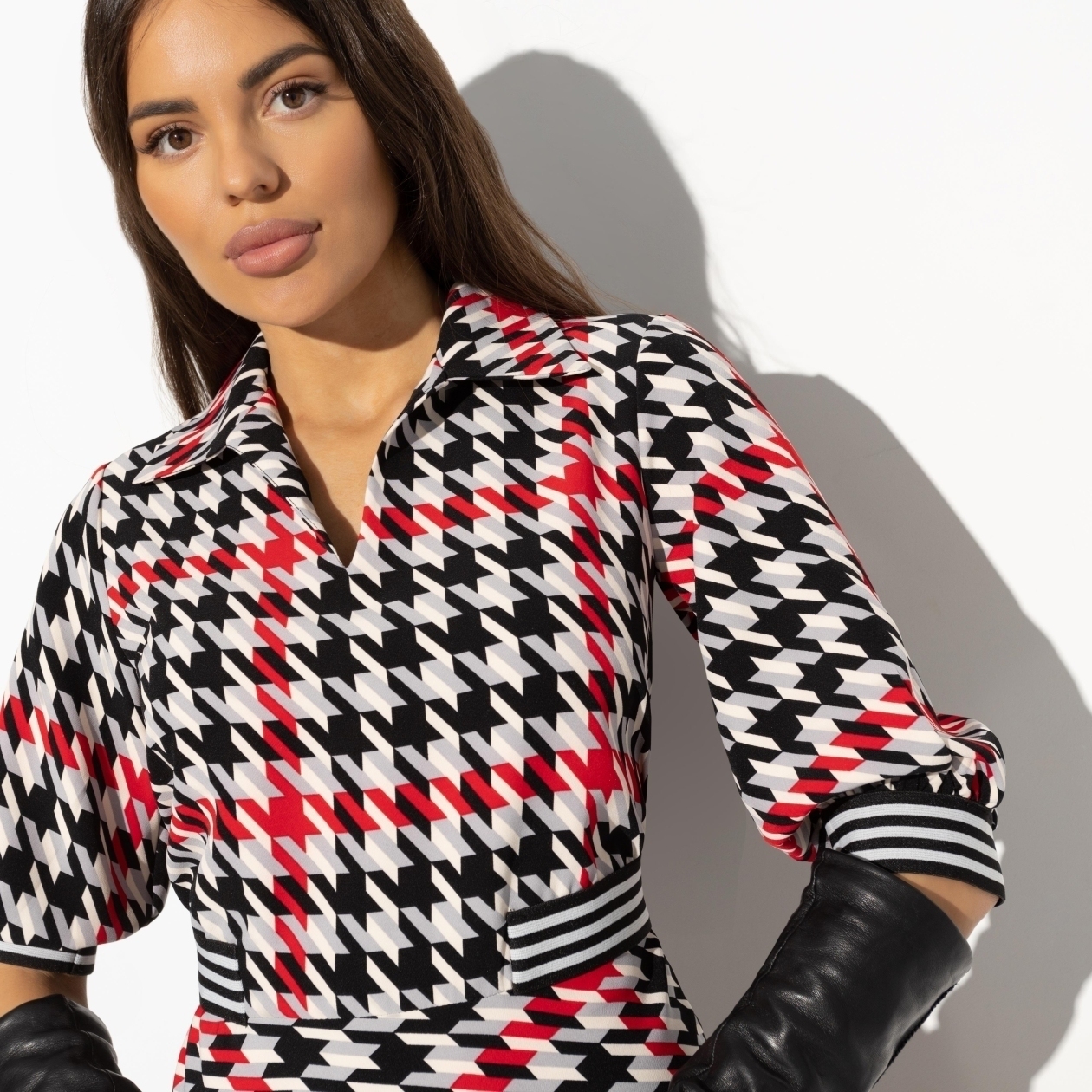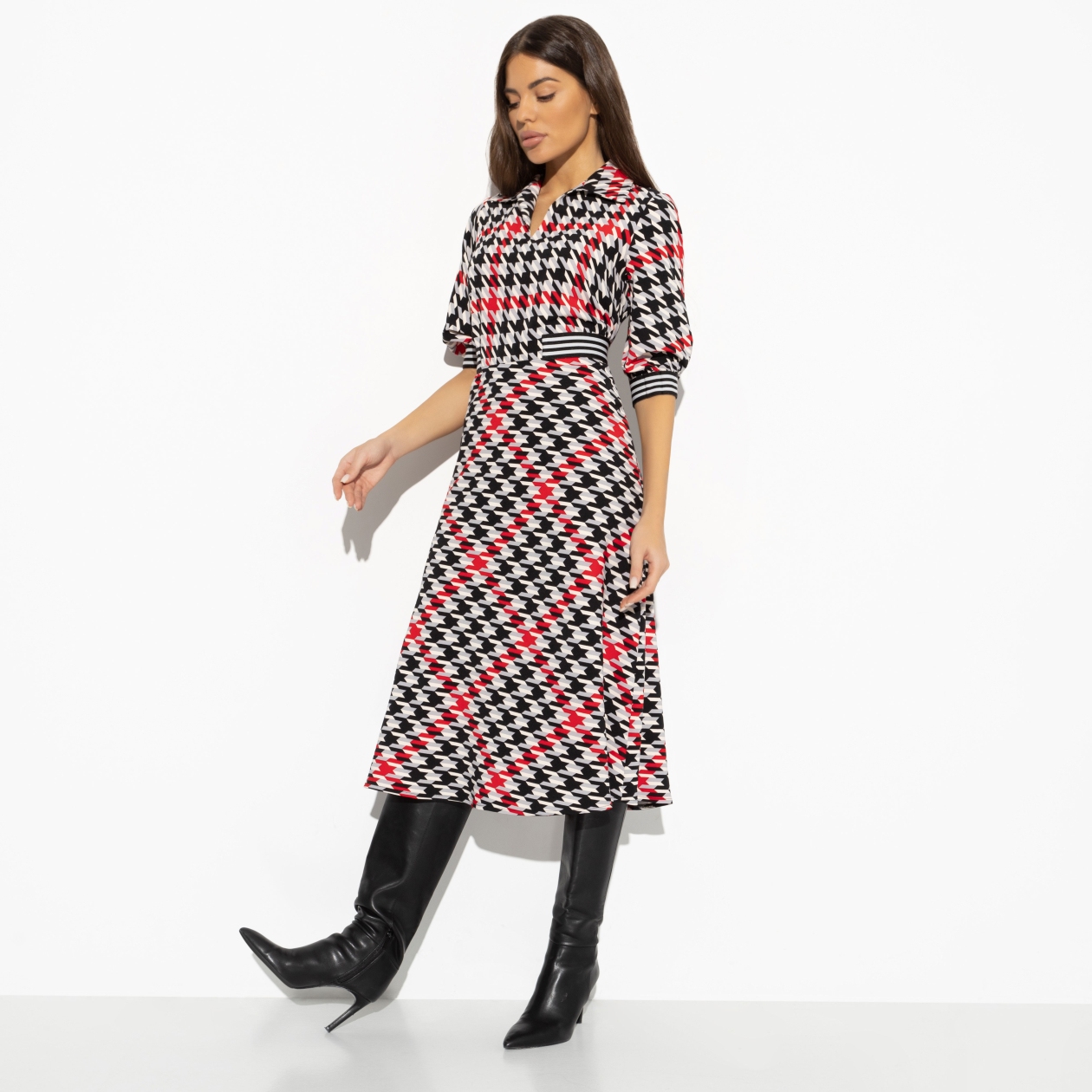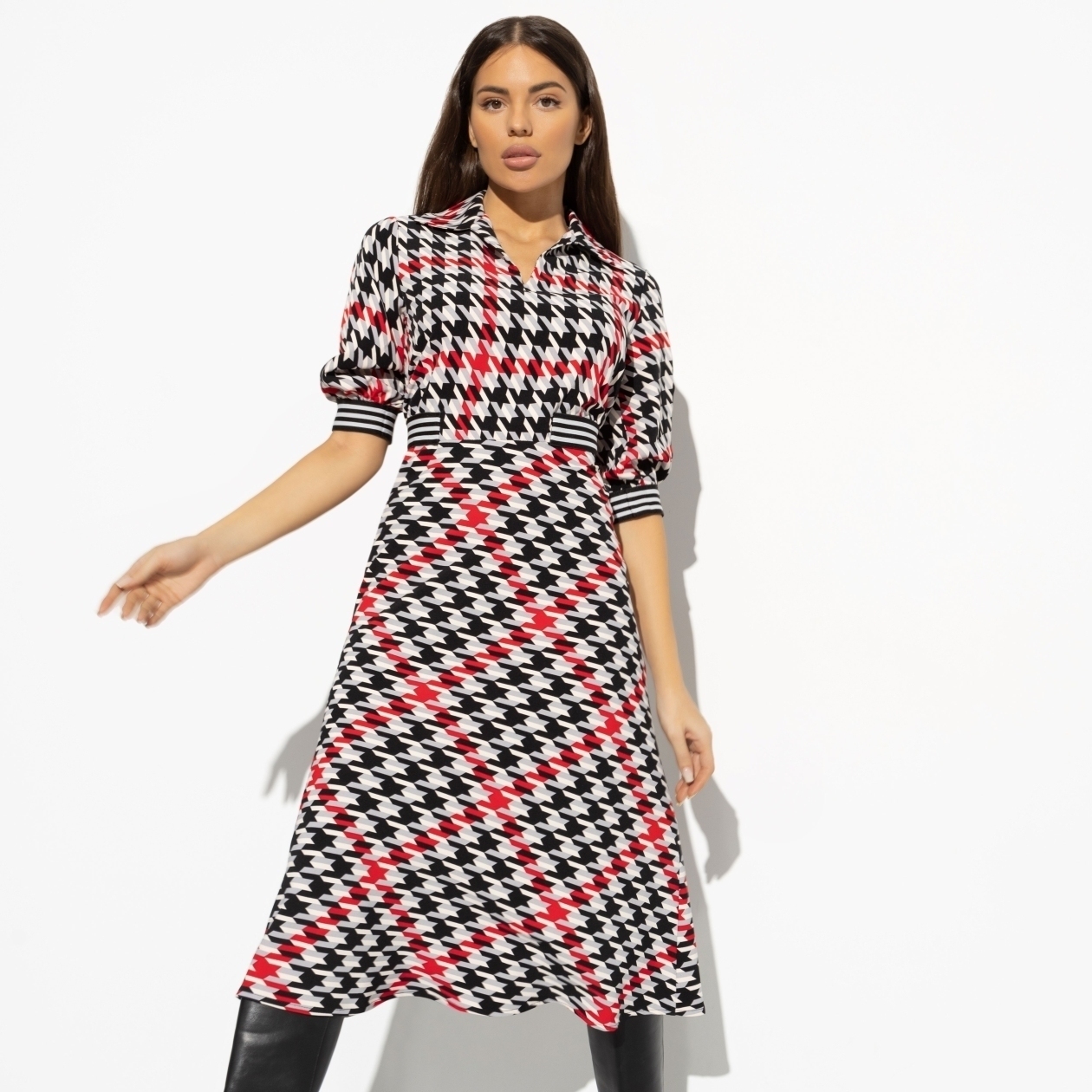 Синоним европейского шика и любимый принт принцессы Дианы – гусиная лапка снова в спинке трендов. Pied-de-poule – культовый принт в исполнении CHARUTTI заиграл новым красным цветом. Повод снова прочувствовать свое аристократическое происхождение. Платье приталенного силуэта в длине миди. Акцентные вставки-резинки на рукавах и на талии.