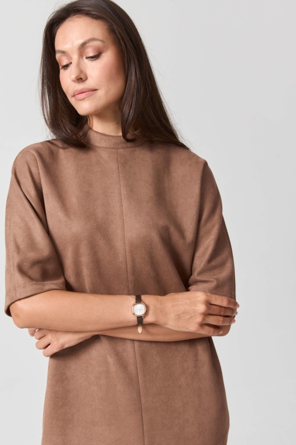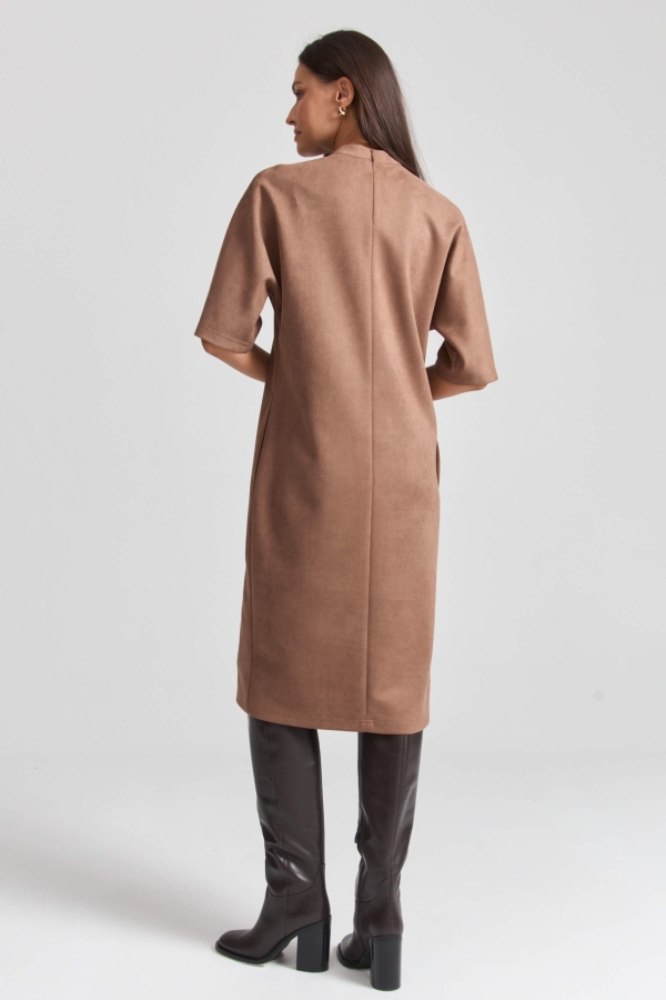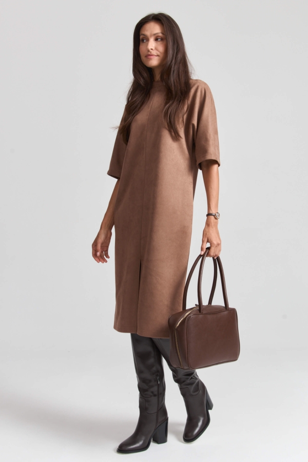 Bestseller - платье длины миди из эко-замши базового оттенка. Модель прямого силуэта, с цельнокроеным коротким рукавом.. По переду средний шов, высокий разрез. На спинке застежка - молния. В боковых швах карманы.