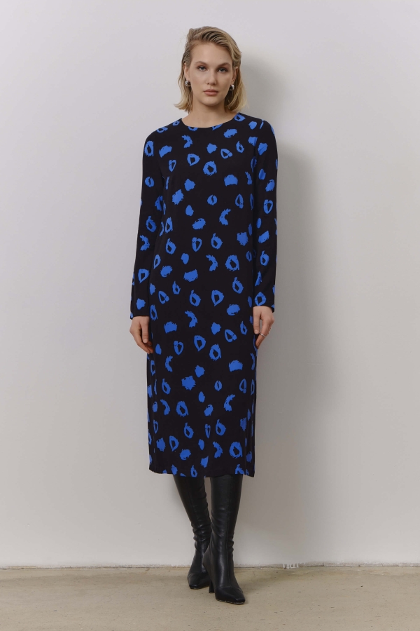 Лаконичное платье из вискозы с оригинальным принтом. Модель прямого силуэта. Втачной прямой рукав. По спинке разрез. В комплекте пояс из основной ткани.