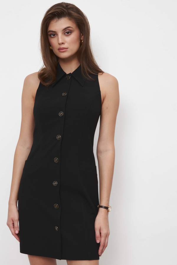 Стильное платье из костюмного полотна высокого качества. Модель полуприлегающего силуэта. Перед дополнен рельефами и листочками. Застежка на акцентные пуговицы. Воротник рубашечный со стойкой. Изделие на подкладке из поливискозы.