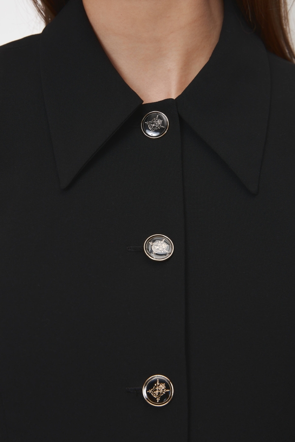 Стильное платье из костюмного полотна высокого качества. Модель полуприлегающего силуэта. Перед дополнен рельефами и листочками. Застежка на акцентные пуговицы. Воротник рубашечный со стойкой. Изделие на подкладке из поливискозы.