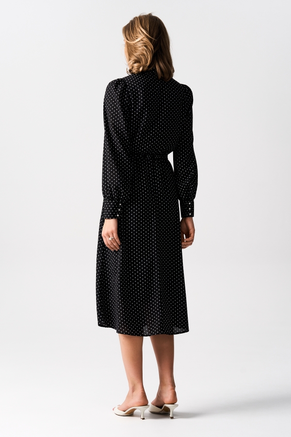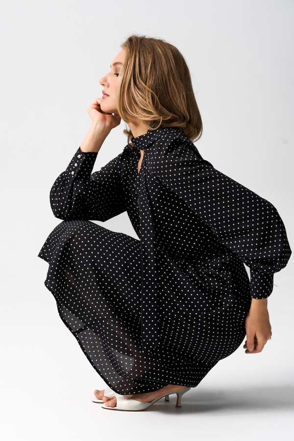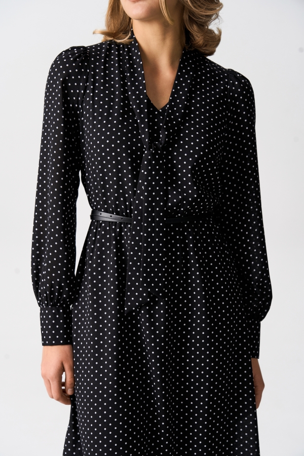 Платье из шифона длины миди. Модель отрезная по линии талии. Линия талии поддерживается узкой резиной. Горловина оформлена воротником-стойкой, переходящей в галстук. Рукава длинные со сборкой по окату, высокие манжеты, застегивающиеся на петли и пуговицы.