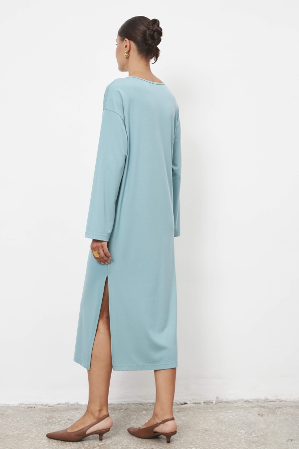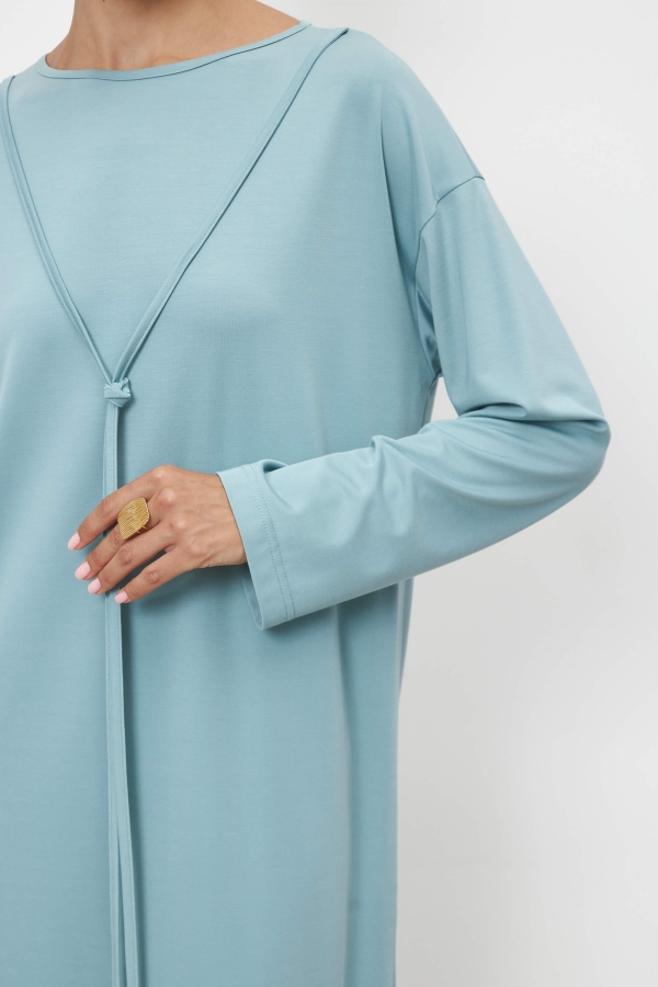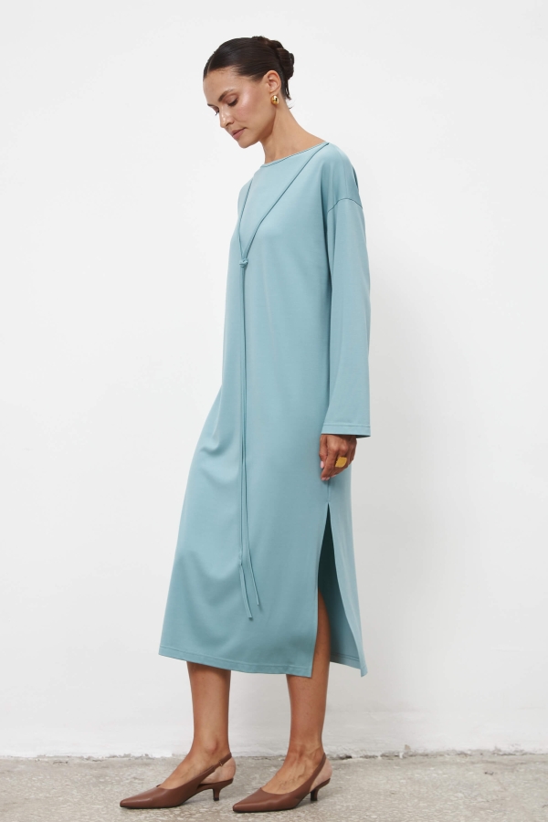 Стильное платье из трикотажного полотна. Модель свободного силуэта. Вырез горловины - лодочка. Длинный прямой рукав. По переду декоративные завязки. В боковых швах разрезы.
