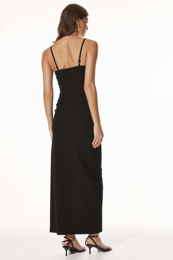 Платье-футляр из костюмной поливискозы. Модель прилегающего силуэта на тонких регулируемых бретелях. Декоративные чашечки по груди. Застежка по спинке на потайную молнию. По переду разрез.