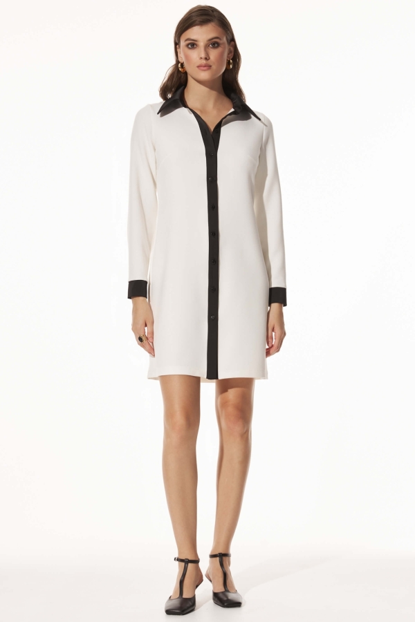 Платье из костюмной поливискозы с контрастной отделкой. Модель прямого силуэта. По переду застежка на петли и пуговицы. Контрастная отделка выполнена из атласа. По спинке рельефы для комфортной посадки.