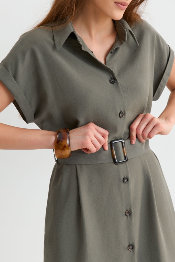 Платье длины миди из лиоцелла. Модель А-силуэта. Воротник отложной со стойкой. Рукав спущенный с манжетой. По переду застежка на петли и пуговицы. По спинке кокетка. Карманы в боковых швах. В комплекте пояс с пряжкой.