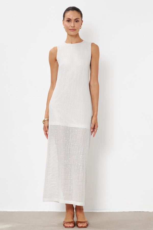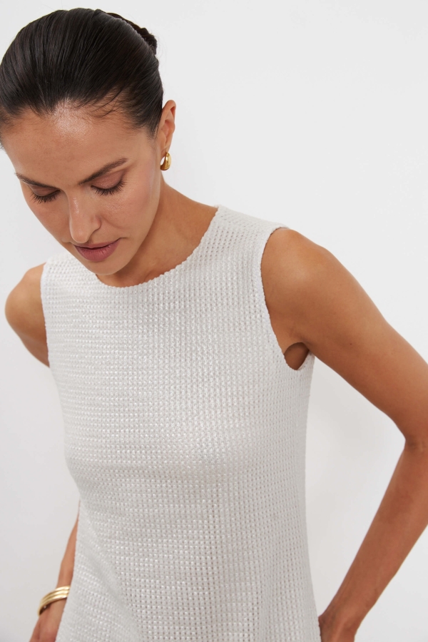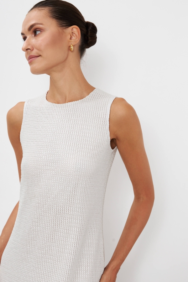 Платье полуприлегающего силуэта из трикотажной сетки с серебристым напылением. Модель с круглой горловиной и открытыми плечами. Застежка по спинке на потайную молнию.