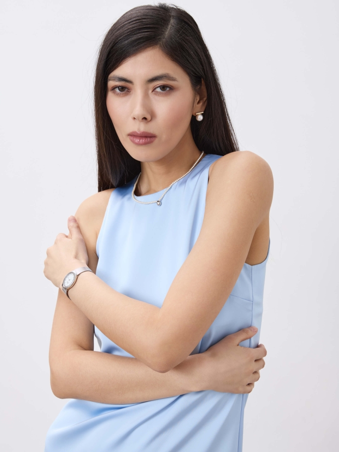Лаконичное нежное платье из атласного полотна высокого качества в небесно голубом оттенке, в длине мини. Платье полуприлегающее прямое с круглой горловиной и застежкой на петлю и пуговицу на спинке.