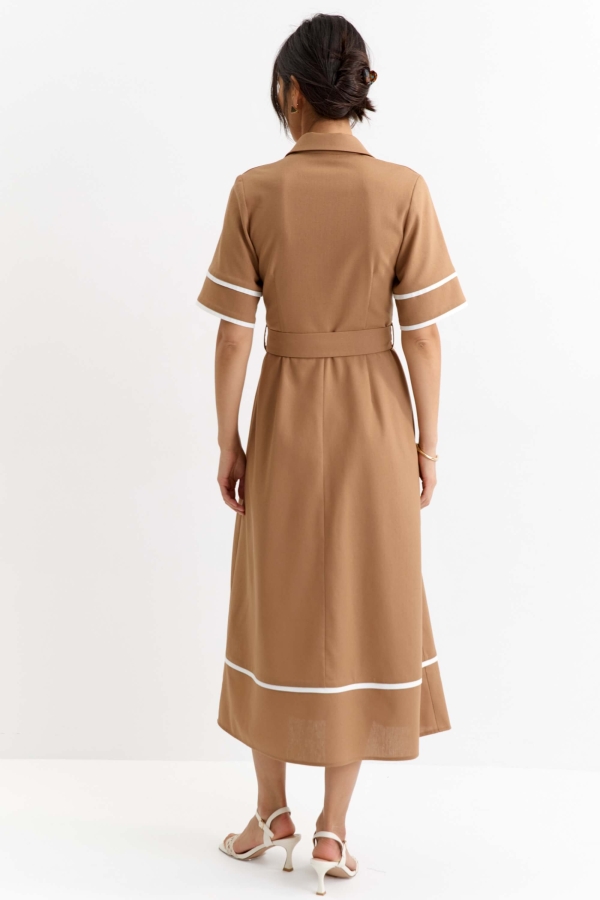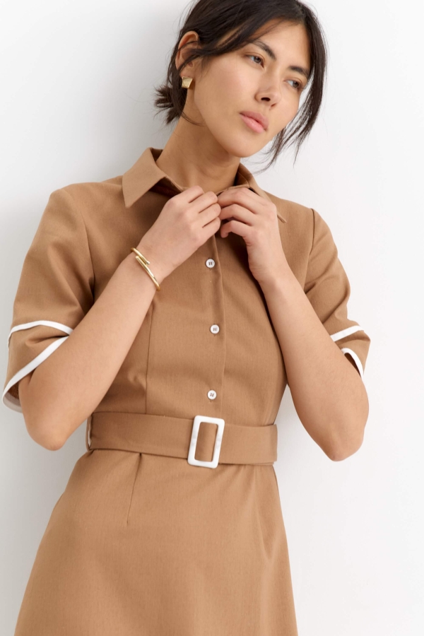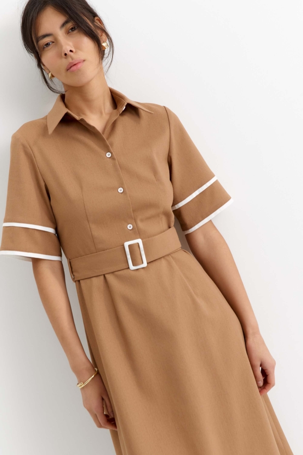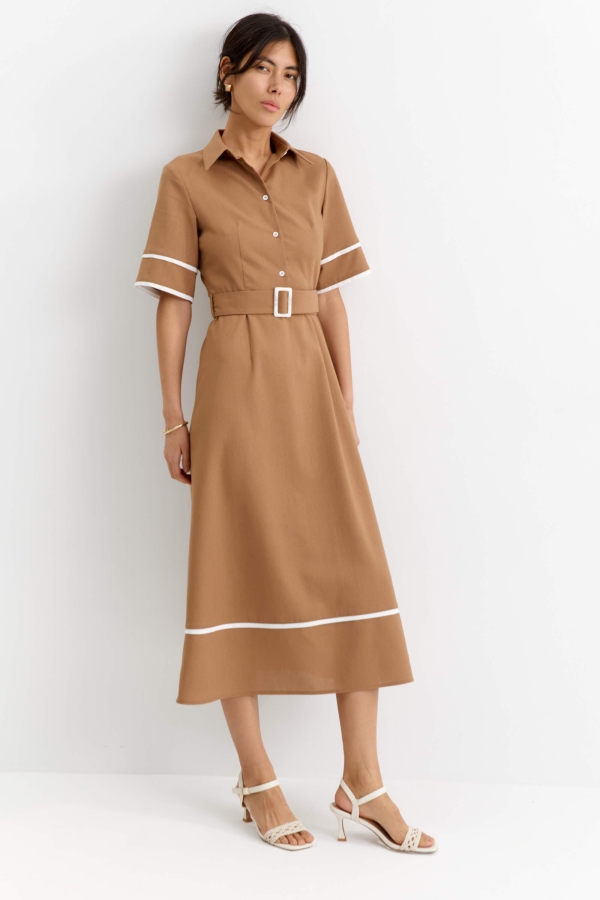 Платье из льняного полотна с контрастной отделкой. Модель полуприлегающего силуэта с отрезной линией талии. Рукав втачной. Воротник отложной, со стойкой. Застежка на петли пуговицы, в боковом шве потайная молния. В комплекте пояс из основной ткани с акцентной пряжкой.