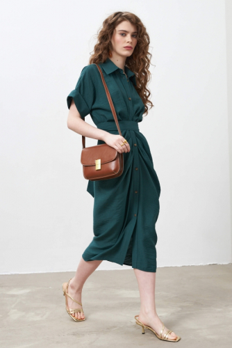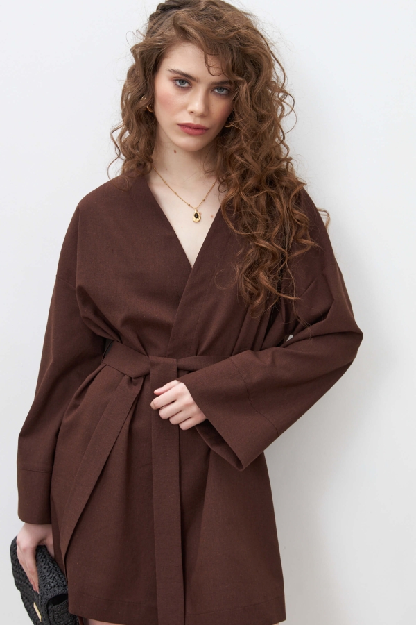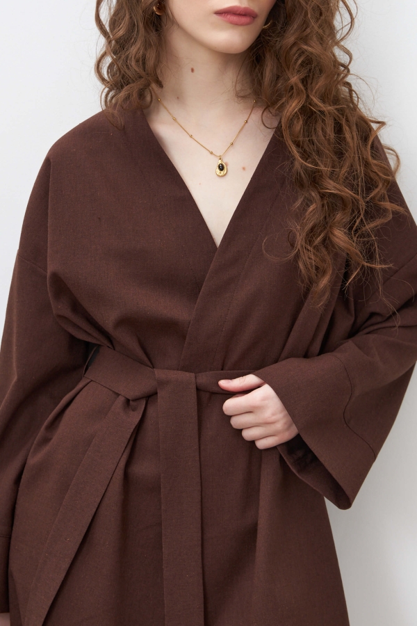 Лаконичное стильное платье из льняного полотна в благородном шоколадном цвете в длине мини. Свободное платье кимоно на запахе, рукав спущенный расклешенный к низу с отрезной манжетой. На талии шлевки и пояс из основной ткани.