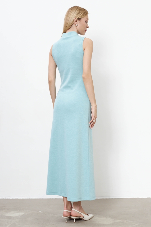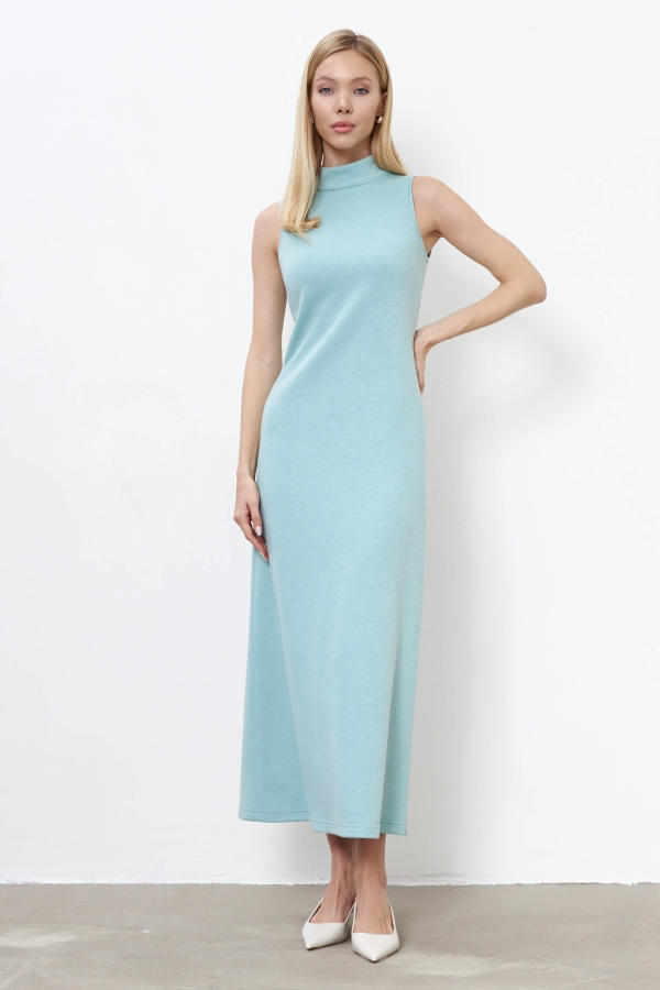 Платье из трикотажного полотна длины миди. Модель прилегающего силуэта, расширенное к низу. Воротник-стойка.