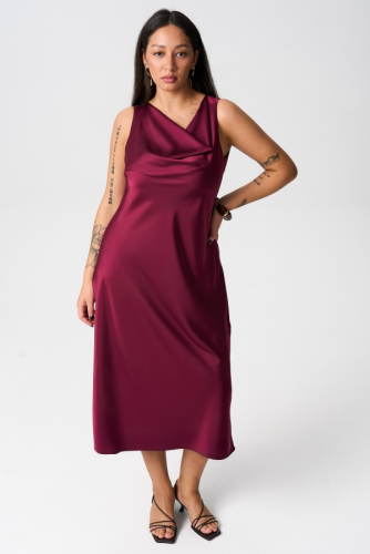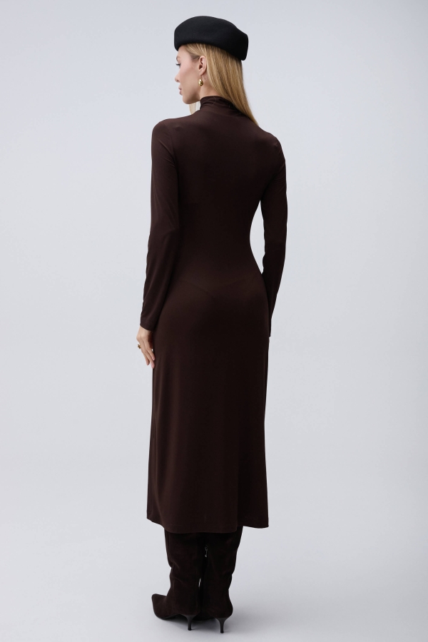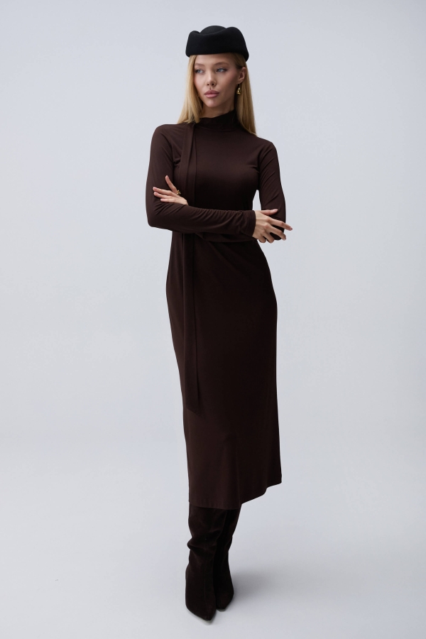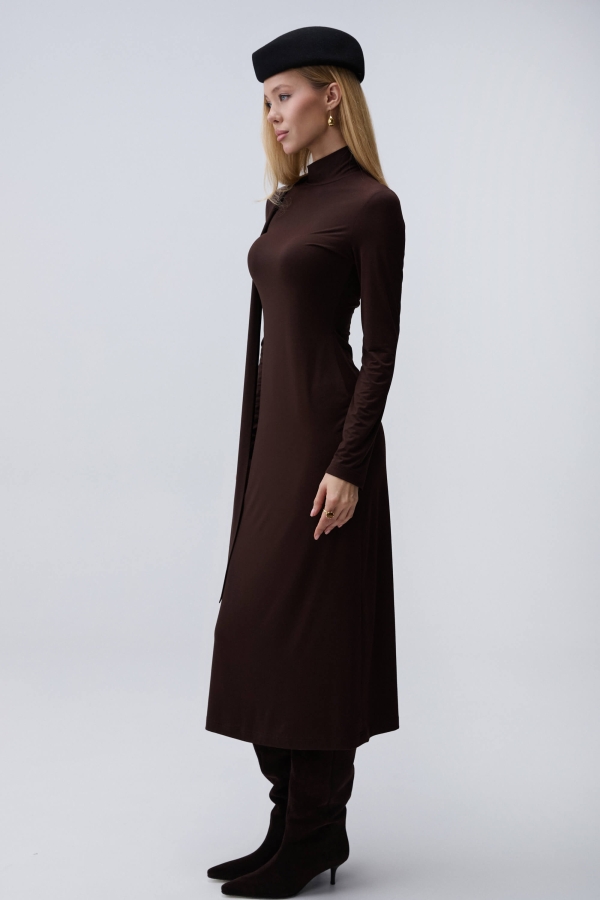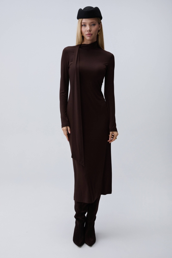Элегантное платье из вискозного трикотажа. Модель прилегающего силуэта. Воротник-стойка переходящий в шарф. Юбка к низу расширяется. Рукав длинный.