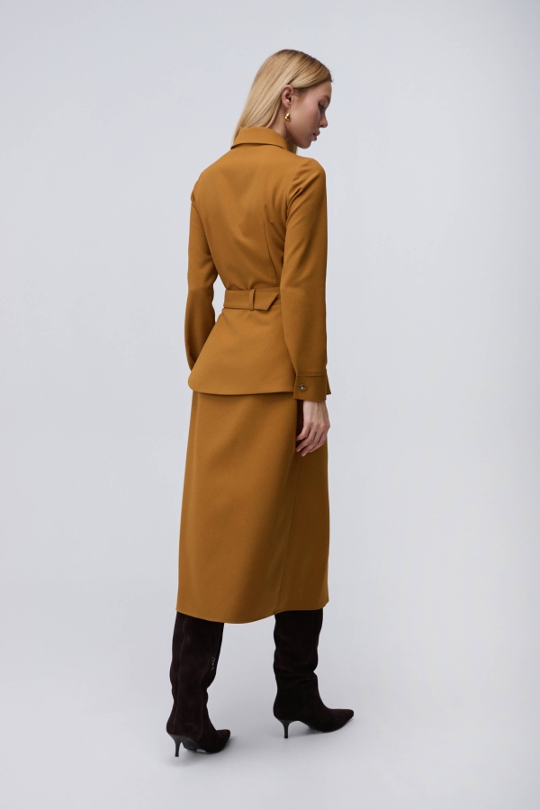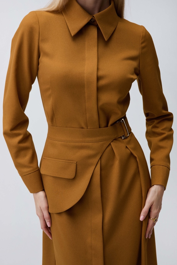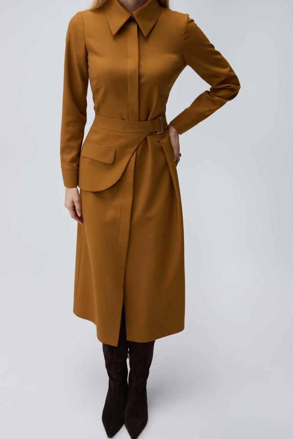 Платье длины миди с поясом-баской. Модель полуприлегающего силуэта с отрезной линией талии. По переду супатная застежка. Воротник отложной со стойкой на акцентную застежку петлю и пуговицу. В комплекте пояс-баска с металлической пряжкой и шлевкой, с декоративным клапаном, на подкладе.