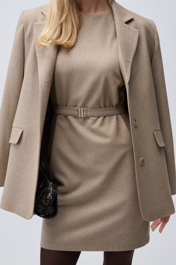 Базовое платье-сарафан из костюмного полотна с шерстью. Модель прямого силуэта. По спинке застежка-потайная молния. Горловина круглая. Пояс из основного материала с металлической пряжкой, по спинке резинка.
