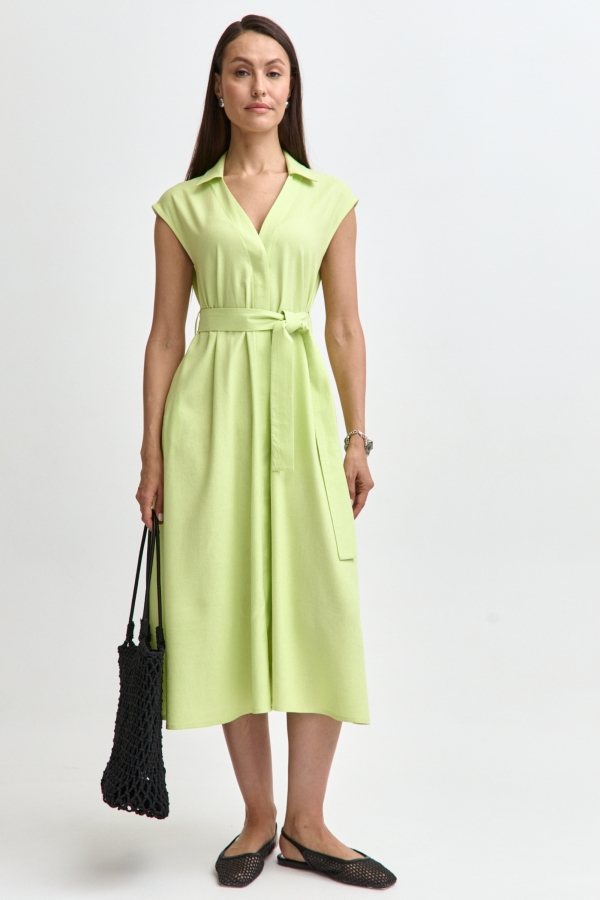 Платье из льняного полотна длины миди. Модель свободного А-силуэта. По переду V-вырез с отложным воротником на стойке, застежка супатная на петли и пуговицы. Рукав спущенный. В боковых швах шлевки. В комплекте пояс из основной ткани.