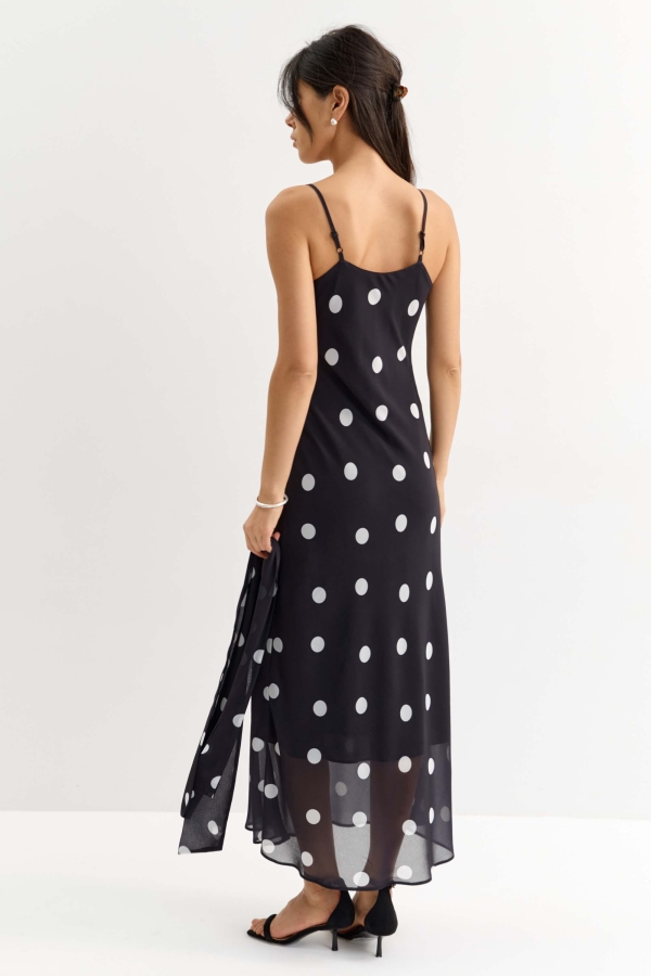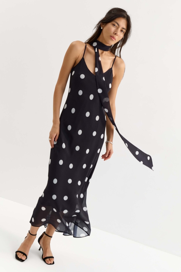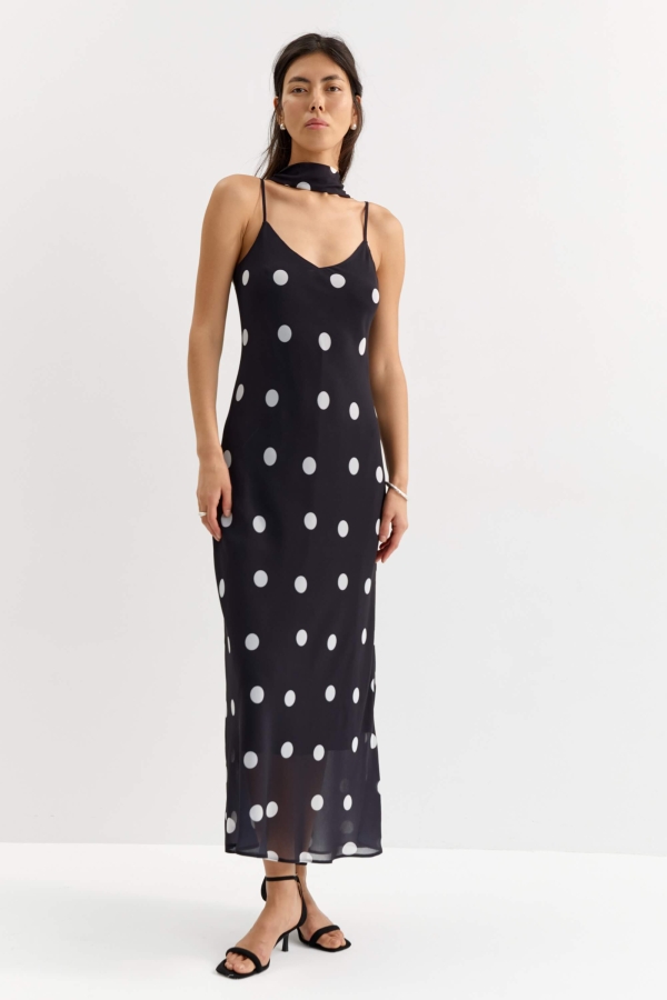 Платье в бельевом стиле длины миди из креп-шифона. Модель полуприлегающего силуэта, выкроенная по косой. Бретели на регуляторах. В комплекте шарф из основного материала. Изделие на подкладе.