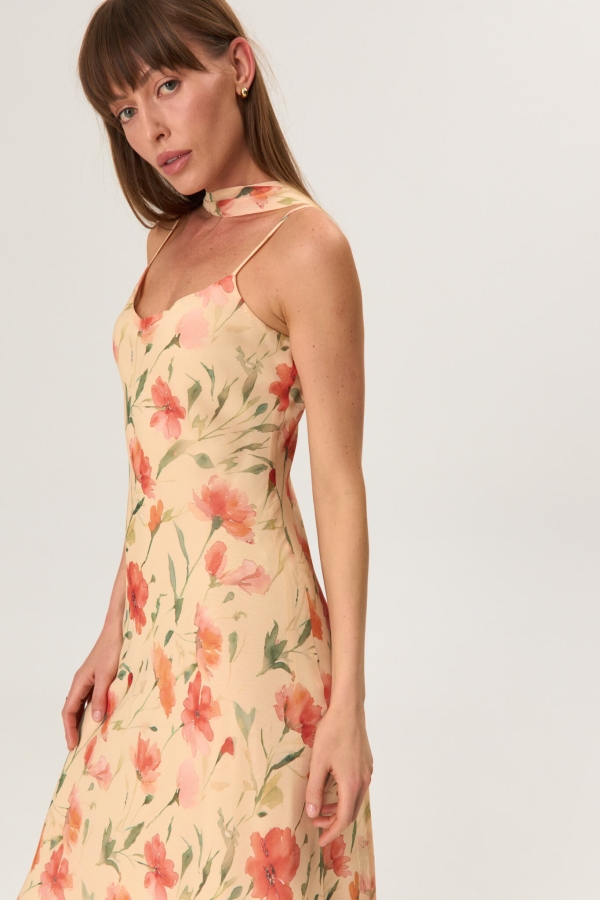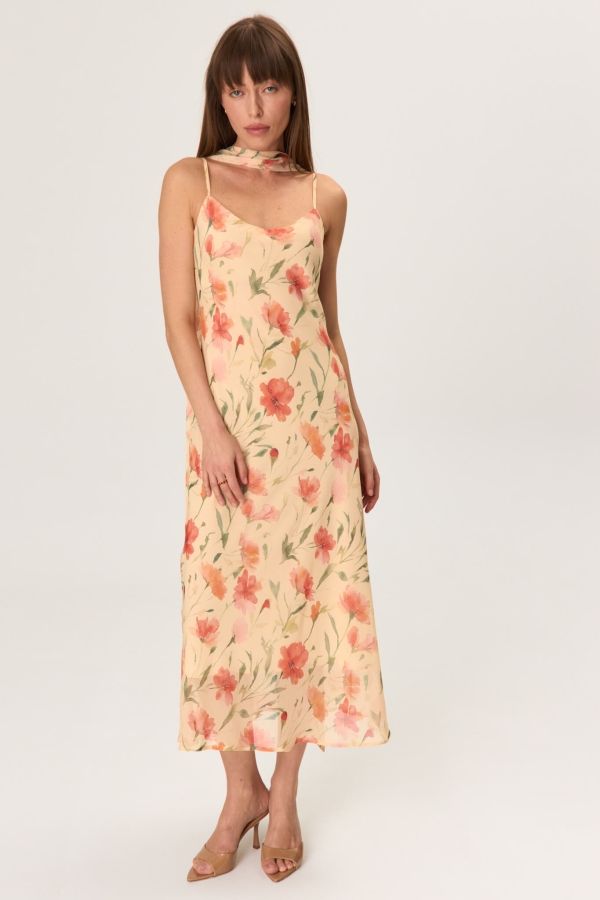 Платье в бельевом стиле длины миди из фактурного шифона. Модель полуприлегающего силуэта, выкроенная по косой. Бретели на регуляторах. В комплекте шарф из основного материала. Изделие на подкладе.