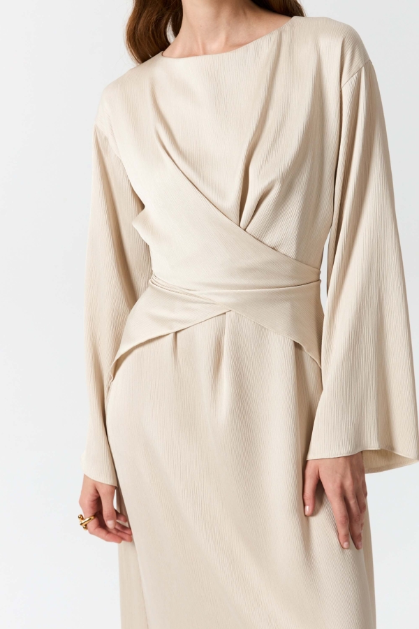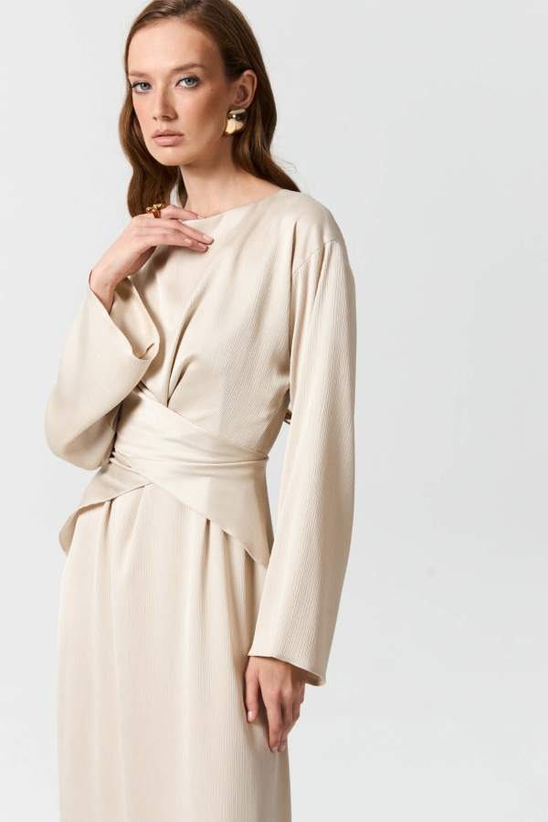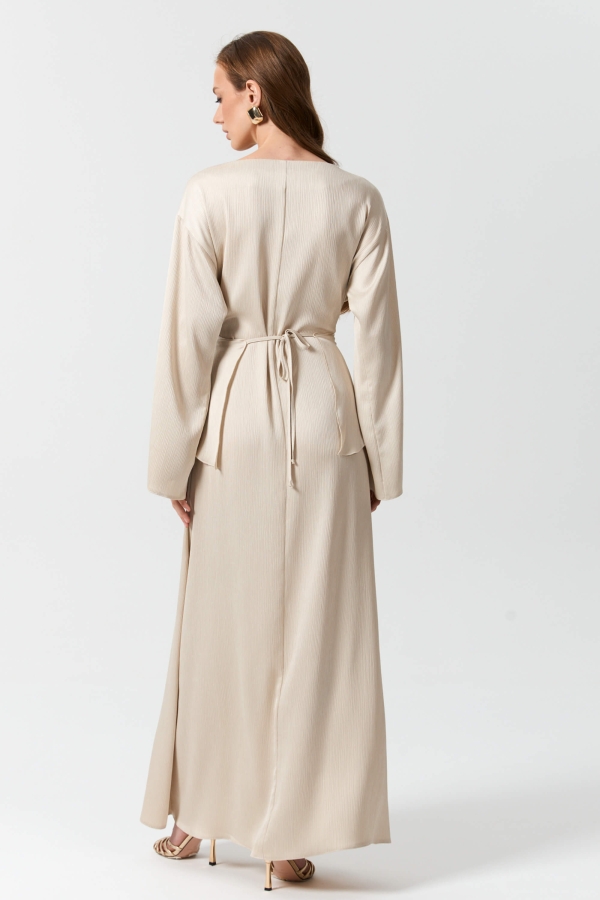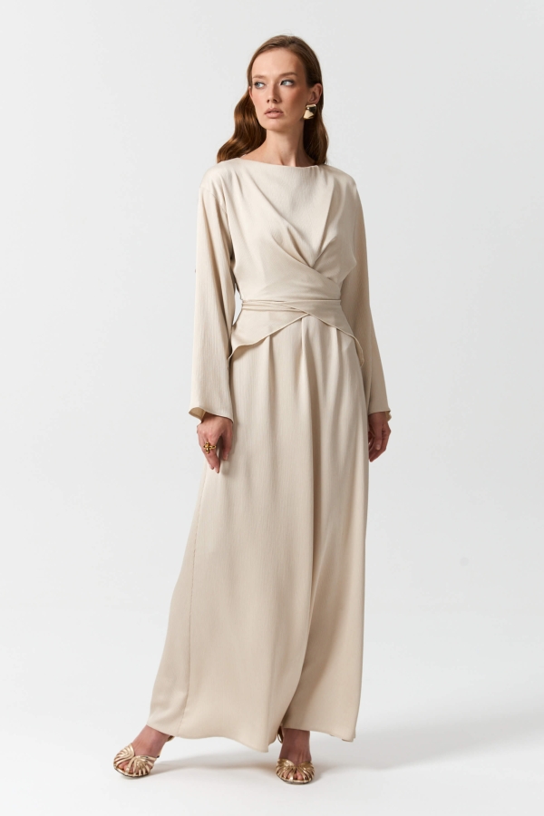 Платье длины макси из матового креш-атласа. Модель полуприлегающего силуэта, расширенное к низу. По переду скругленный вырез, драпировка и декоративные элементы регулируемого запаха с завязками переходящими на спинку. Рукав спущенный, расклешенный к низу.