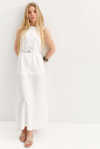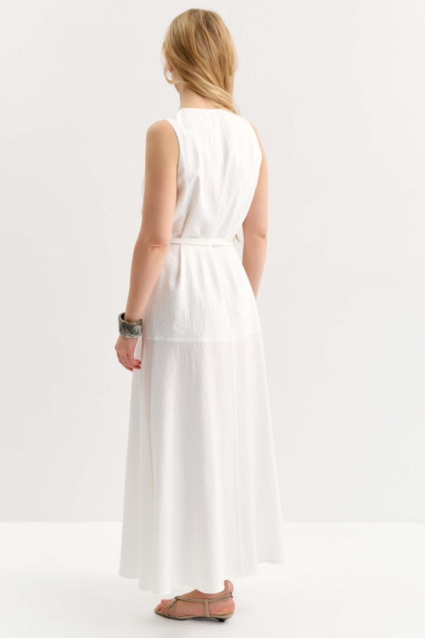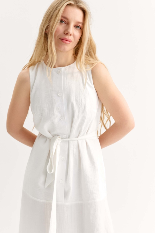 Элегантное платье из плотного фактурного вискозного полотна. Модель а-силуэта, отрезная ниже линии бедра. По переду застежка на петли и пуговицы.Верх изделия на подкладе. В комплекте пояс из основного материала.