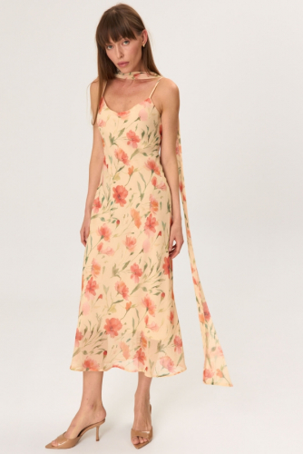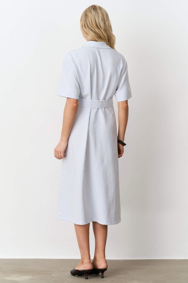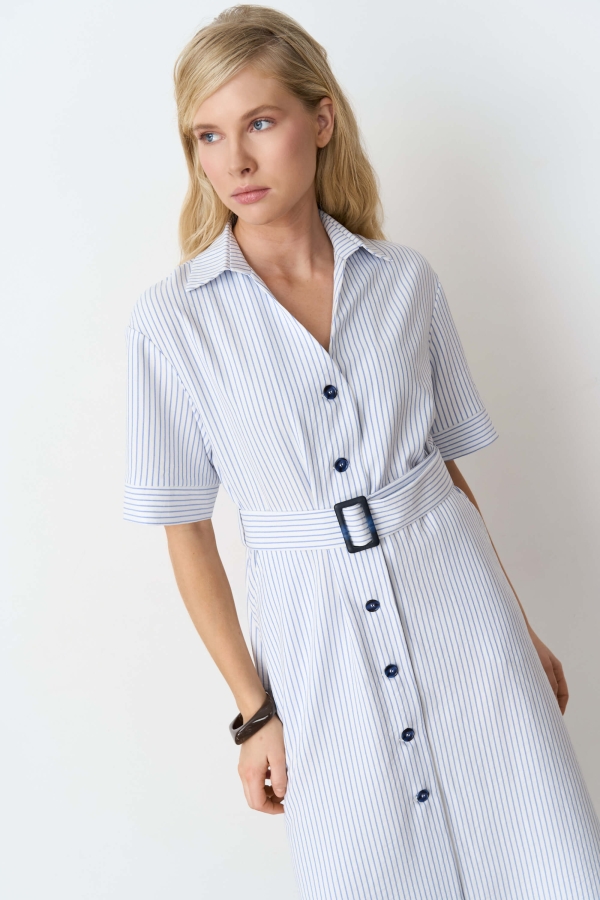 Элегантное платье длины миди в полоску. Модель отрезная по линии талии, умеренно расклешенная к низу. По переду застежка на петли и пуговицы и карманы. В комплекте пояс из основной ткани с пряжкой.