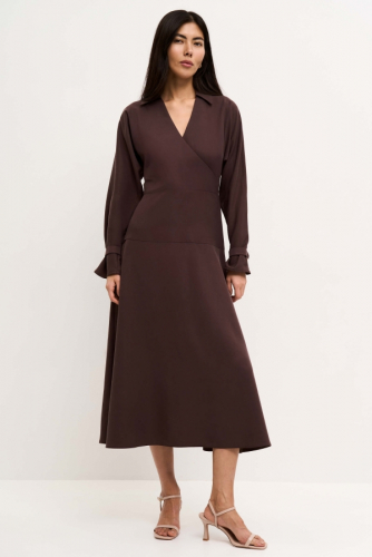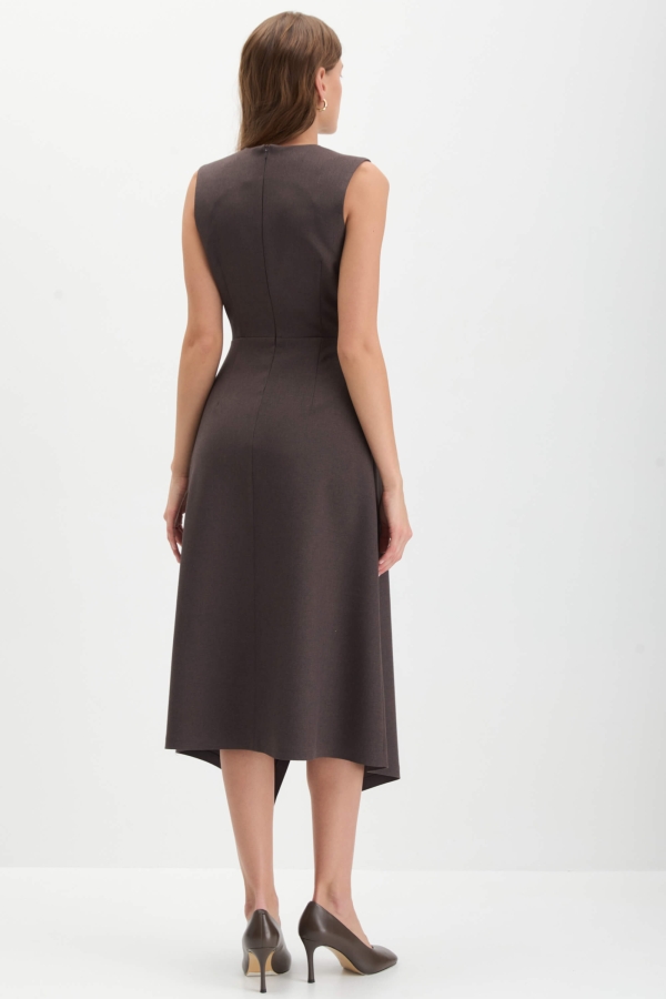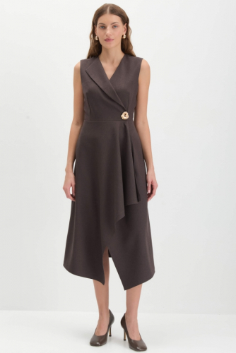 Платье длины миди с ассиметричным низом и акцентной брошью. Модель полуприлегающего силуэта, отрезная по линии талии. По переду имитация запаха с металлической пряжкой и декоративный лацкан. По спинке застежка на потайную молнию и рельефы.