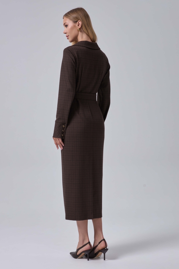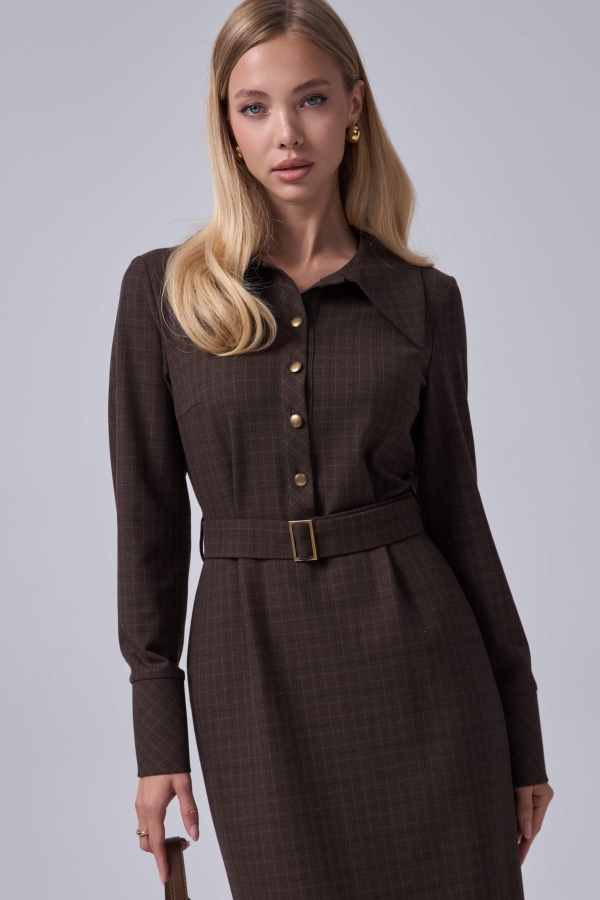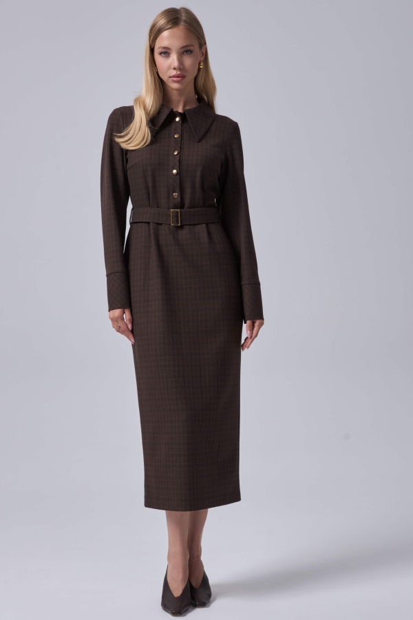 Платье длины миди в деликатную клетку. Модель прямого силуэта, отрезная по линии талии. В верхней части застежка на петли и акцентные пуговицы. По спинке шлица. В комплекте пояс из основного материала с металлической пряжкой. Рукав длинный с широкой манжетой на пуговицы.