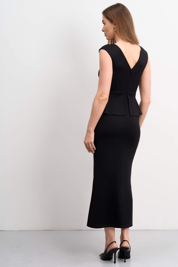 Элегантное платье из трикотажного полотна. Модель полуприлегающего силуэта. Спущенная линия плеча. Отрезная линия талии дополнена баской. По спинке разрез, застежка на потайную молнию.