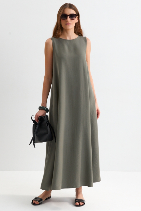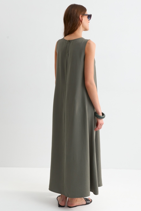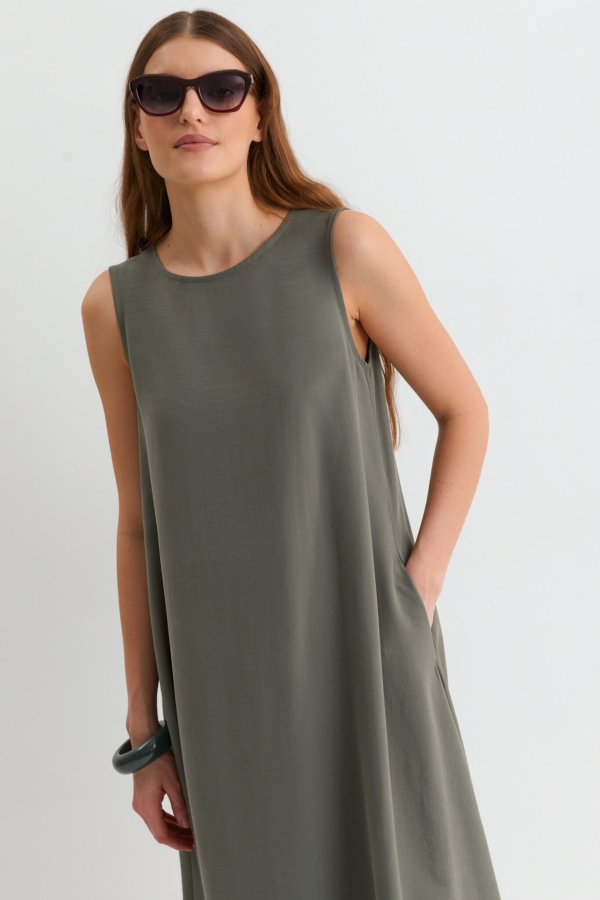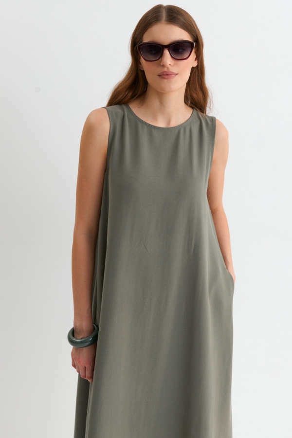 Лаконичное платье из лиоцелла. Модель свободного А-силуэта. В боковых швах карманы. По спинке застежка на пуговицу.