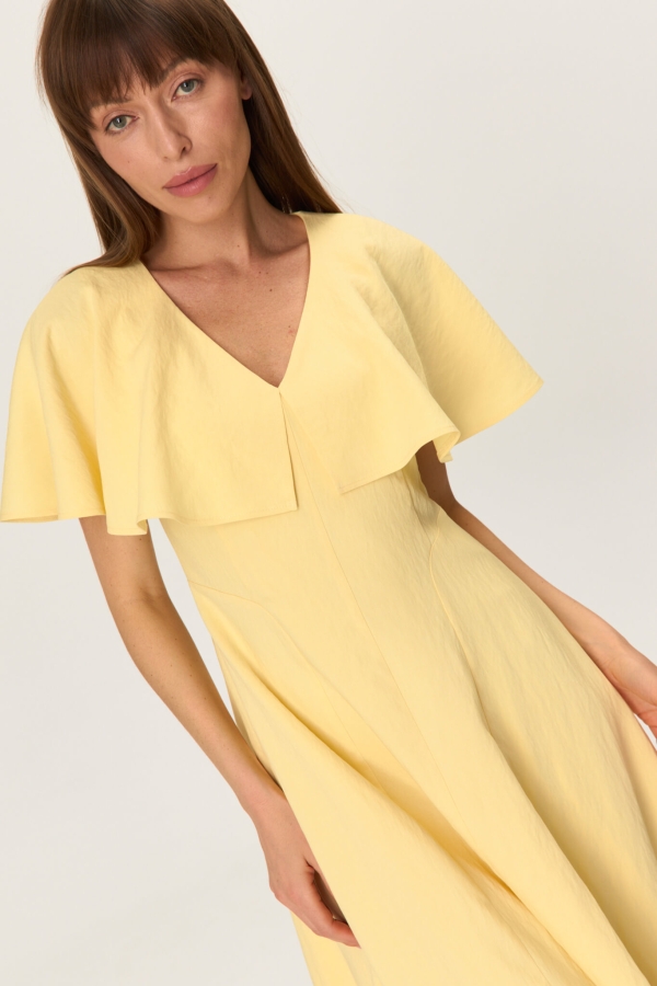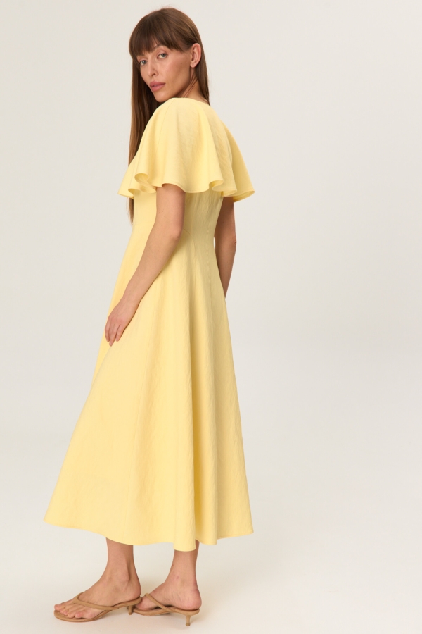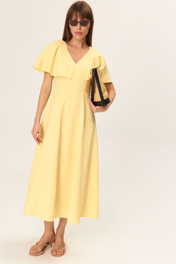 Женственное платье из фактурной вискозы. Модель полуприлегающего силуэта. V-образный вырез горловины оформлен пелериной. По переду и спинке фигурные рельефные швы. Изделие на хлопковом подкладе.