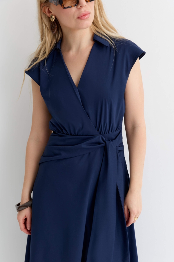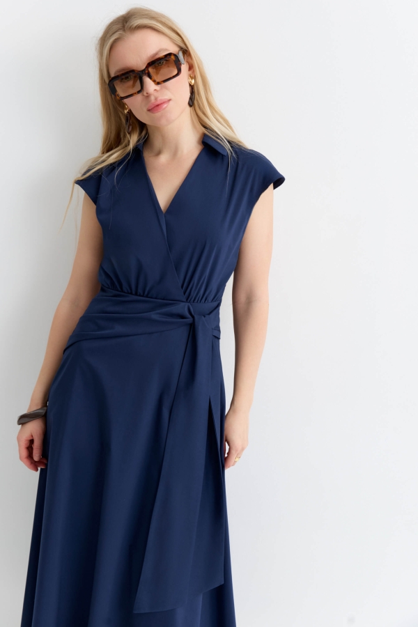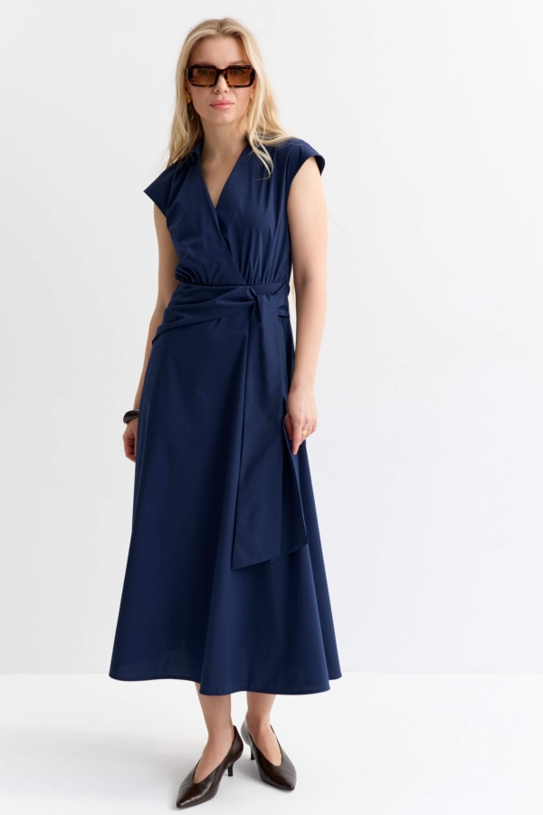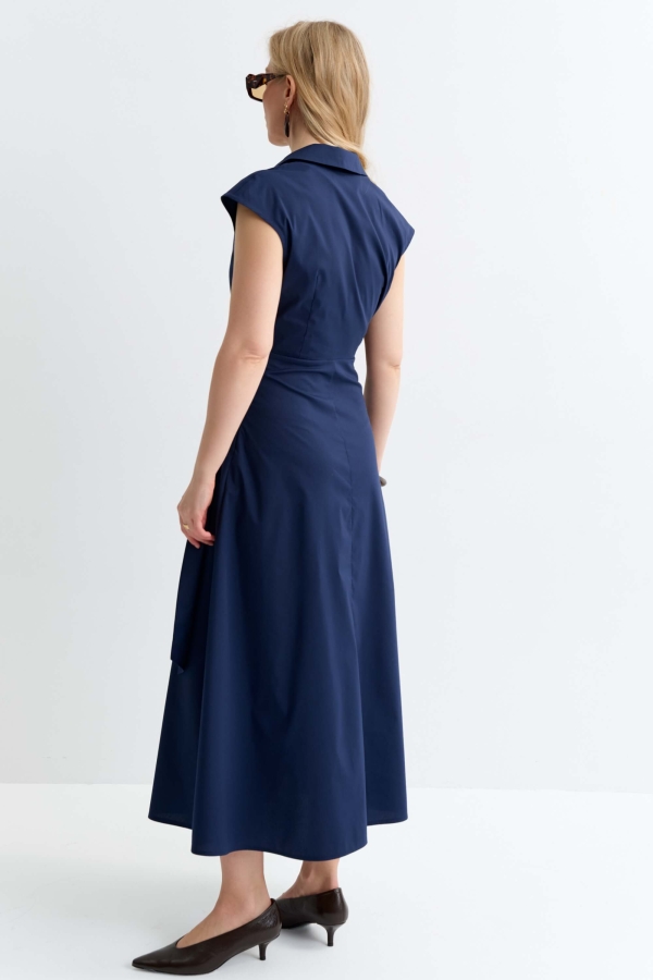 Платье из хлопка с акцентным широким поясом. Модель полуприлегающего силуэта, отрезная по линии талии. В боковом шве на уровне талии и бедер вшит асимметричный пояс, заложенный в драпирующиеся складки. Застежка молния в боковом шве.