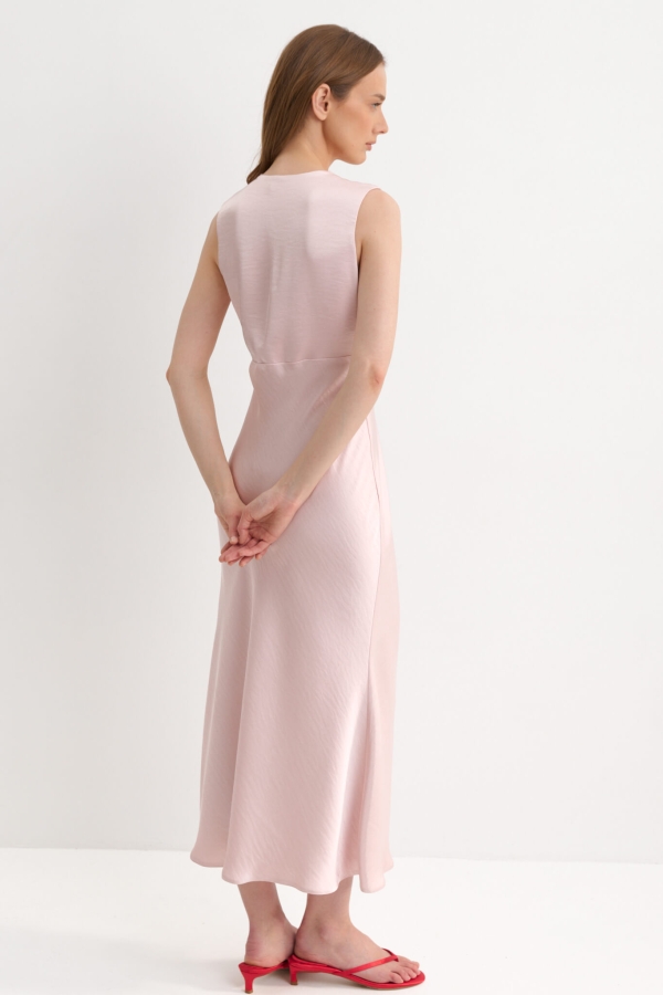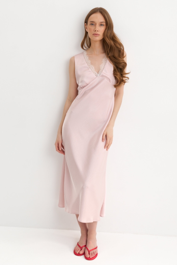 Платье из мягкого крэш-атласа в бельевом стиле. Модель полуприлегающего силуэта. V-образный вырез с отделкой французским кружевом. По переду и спинке фигурный подрез. Верх на подкладке из основного материала (двойной).