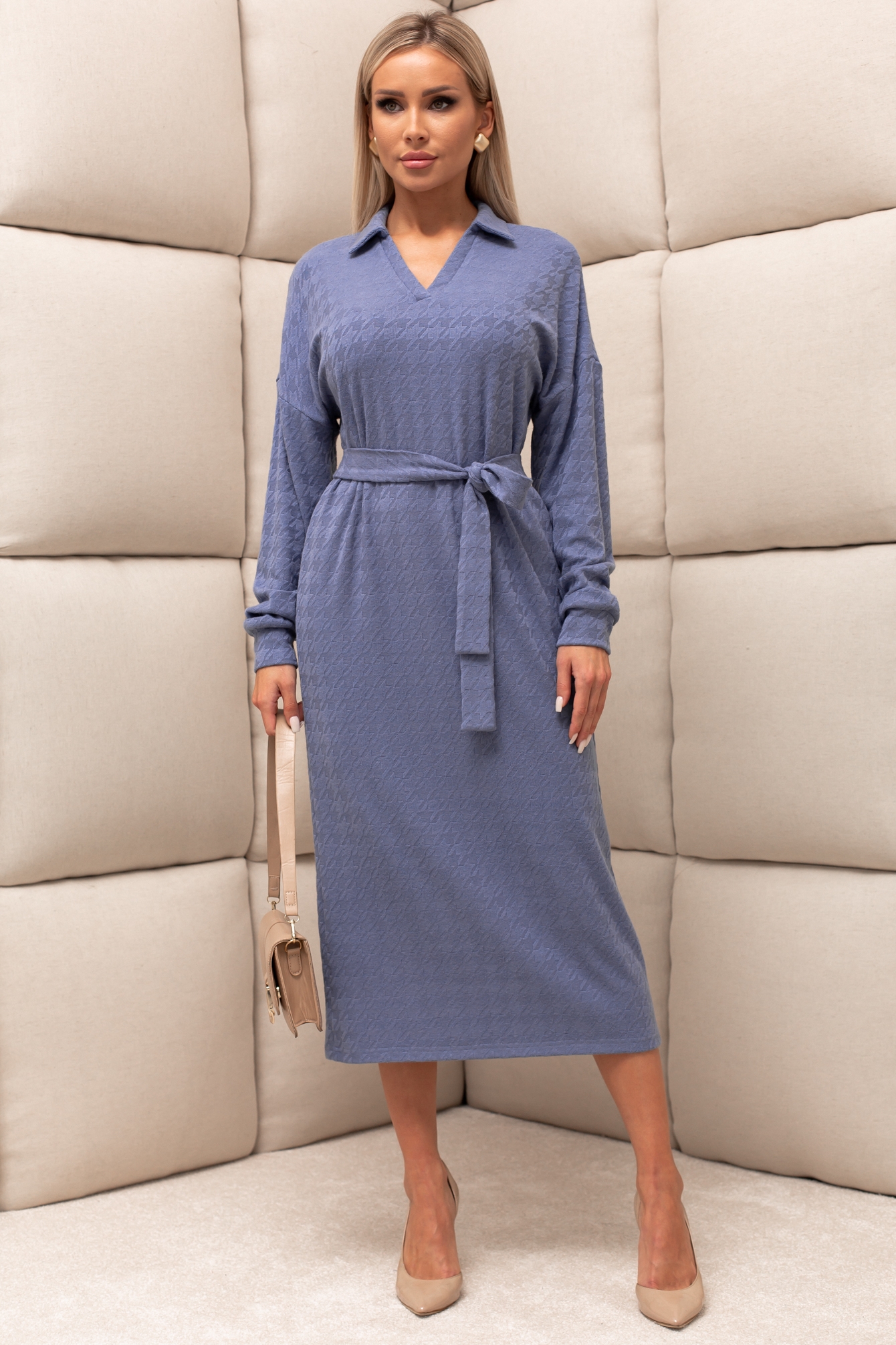 Комфортное платье прямого кроя выполнено из однотонного трикотажного полотна. V - образная горловина оформлена отложным воротником на стойке. Длинный втачной рукав со спущенным плечом присборен на манжету. Низ ровный, без разрезов. Пояс из основной ткани в комплекте.