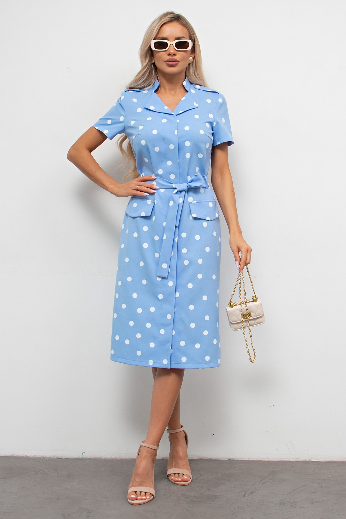 Комфортное платье прямого кроя прекрасно дополнит ваш гардероб. Короткий втачной рукав. Плечевые оформлены погонами. V - образная горловина оформлена воротником стойкой. Модель на планке с супатной застежкой. Перед дополнен накладными клапанами. По линии талии закреплены шлевки под пояс. Низ ровный, без разрезов.
