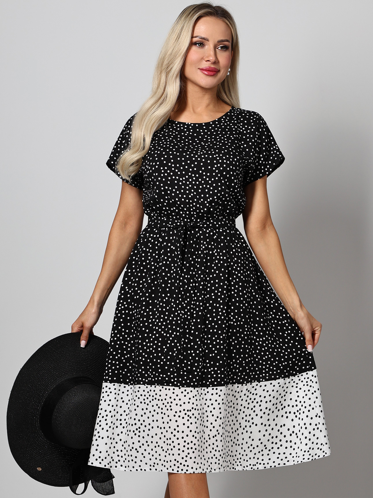 Платье свободного кроя с коротким цельнокроенным рукавом - лучший выбор для гардероба! Волан по низу юбки придает образу романтический настрой, а для большей элегантности пояс платья выполнен из той же ткани, что и волан.