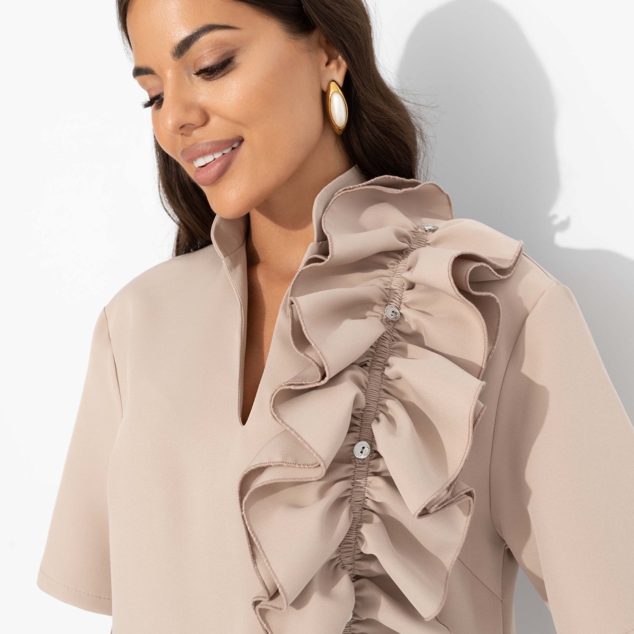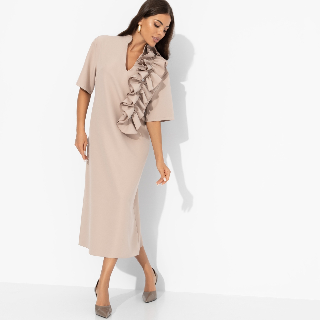 Дорогой и элегантный, бежевый цвет делает вас заметной в черно-белом обществе. Платье CHARUTTI в цвете какао с молоком подойдет для встреч с подругами, свидания, похода в театр или знакомства с семьей возлюбленного. Платье прямого кроя в длине миди. Разрез сбоку. Объемный декор съемный. Крепление на миниатюрных пуговицах.