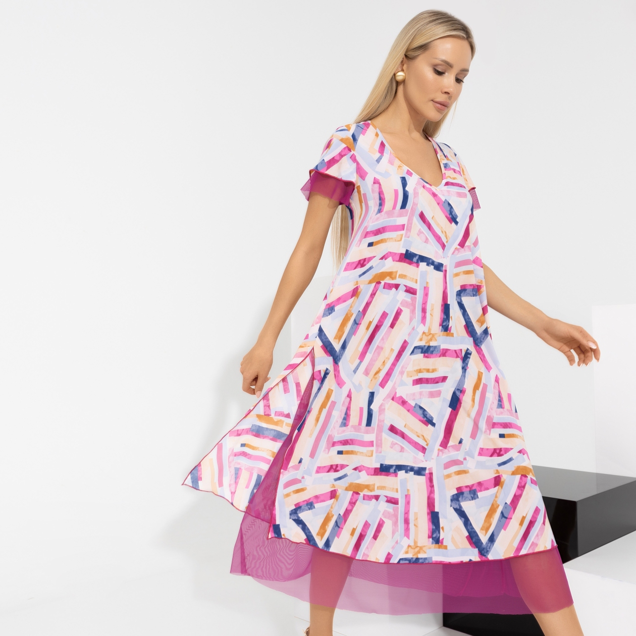 Помимо изысканного дизайна, это платье предлагает непревзойденный комфорт. Сочетание воздушного шифона с эластичной сеткой-стрейч позволяет ему подстраиваться под фигуру, даря ощущение комфорта и свободы движений. Такое платье станет не только визуальным наслаждением, но и приятным на ощупь. Оно идеально подходит для ленивой прогулки по городу или красочной вечеринки, дополнит коллекцию любого магазина женской одежды и привлечет множество заинтересованных покупательниц. Оптовая закупка платья – это шаг к увеличению разнообразия и качества ассортимента, что может значительно повлиять на успешность вашего бизнеса.