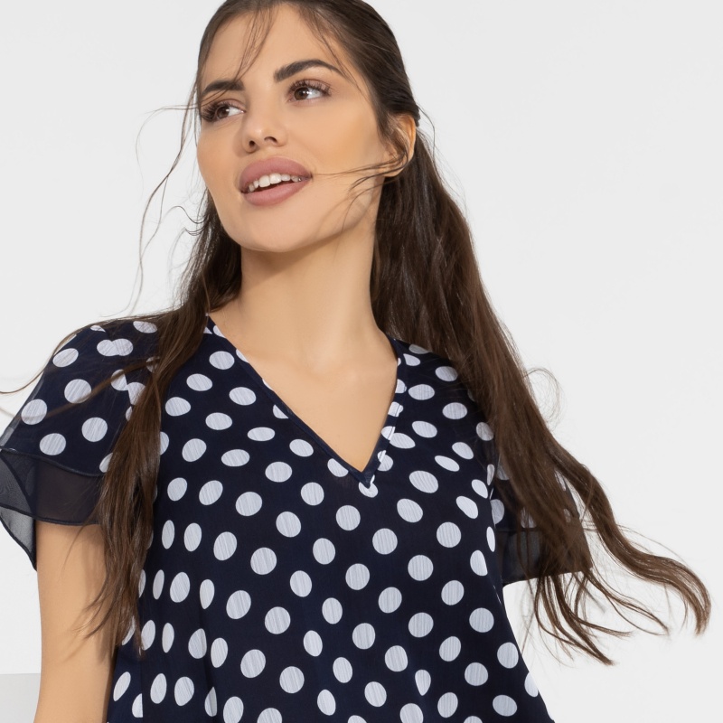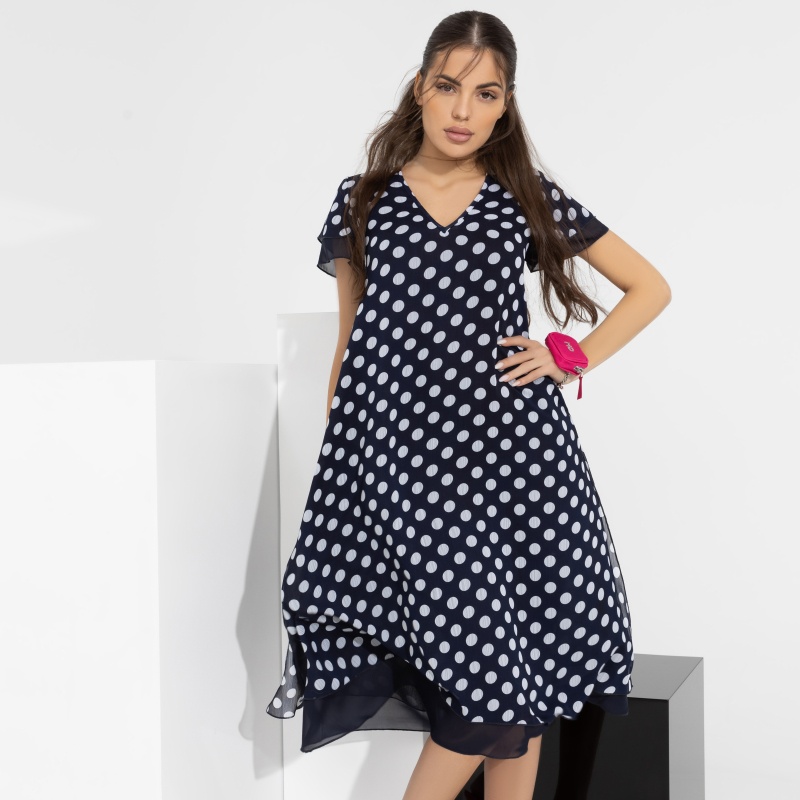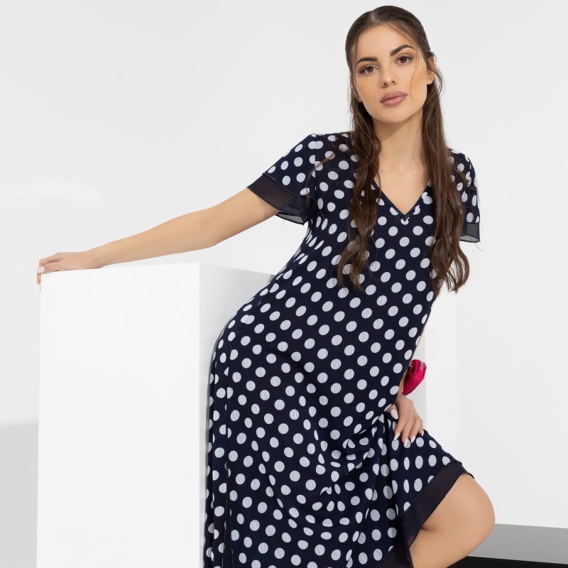 Стилистический комментарий как нельзя лучше подчеркивает силу этого платья. В этот сезон все уверены – горошек правит миром моды. Это не просто тренд, а неожиданное воскрешение классики, которая привносит новую волну вдохновения в гардероб. Эта ткань притягивает взгляды благодаря своей элегантности, а принт добавляет дерзости. При покупке оптом ваши клиенты получат нечто большее, чем просто изделие – это будет повод для гордости и возможность продемонстрировать безупречный вкус. Никто не сможет устоять перед озорной, но в то же время изящной магией, обрамлённой в горошек.