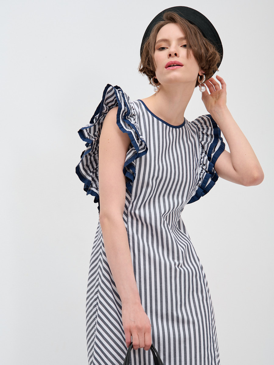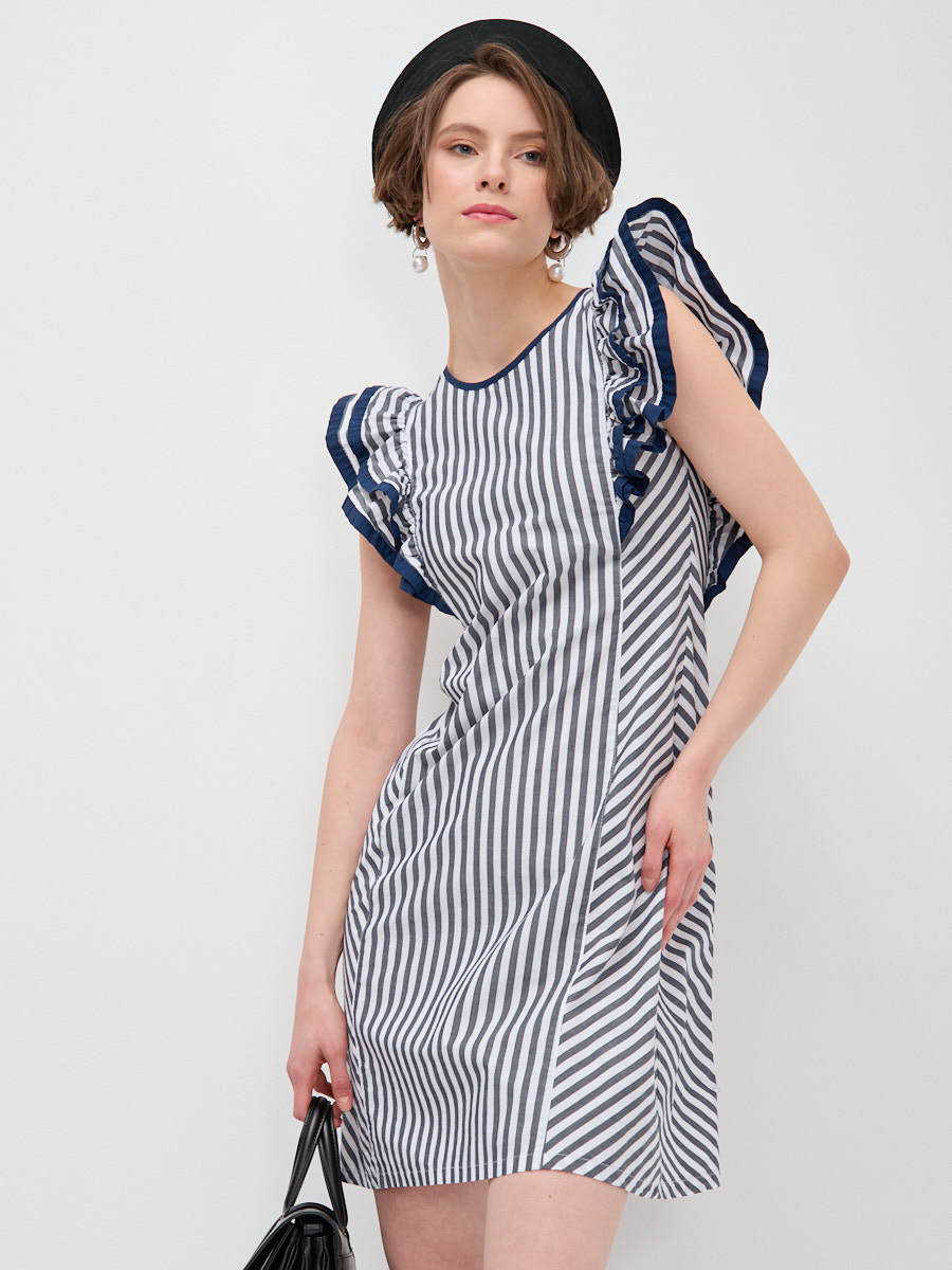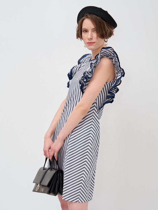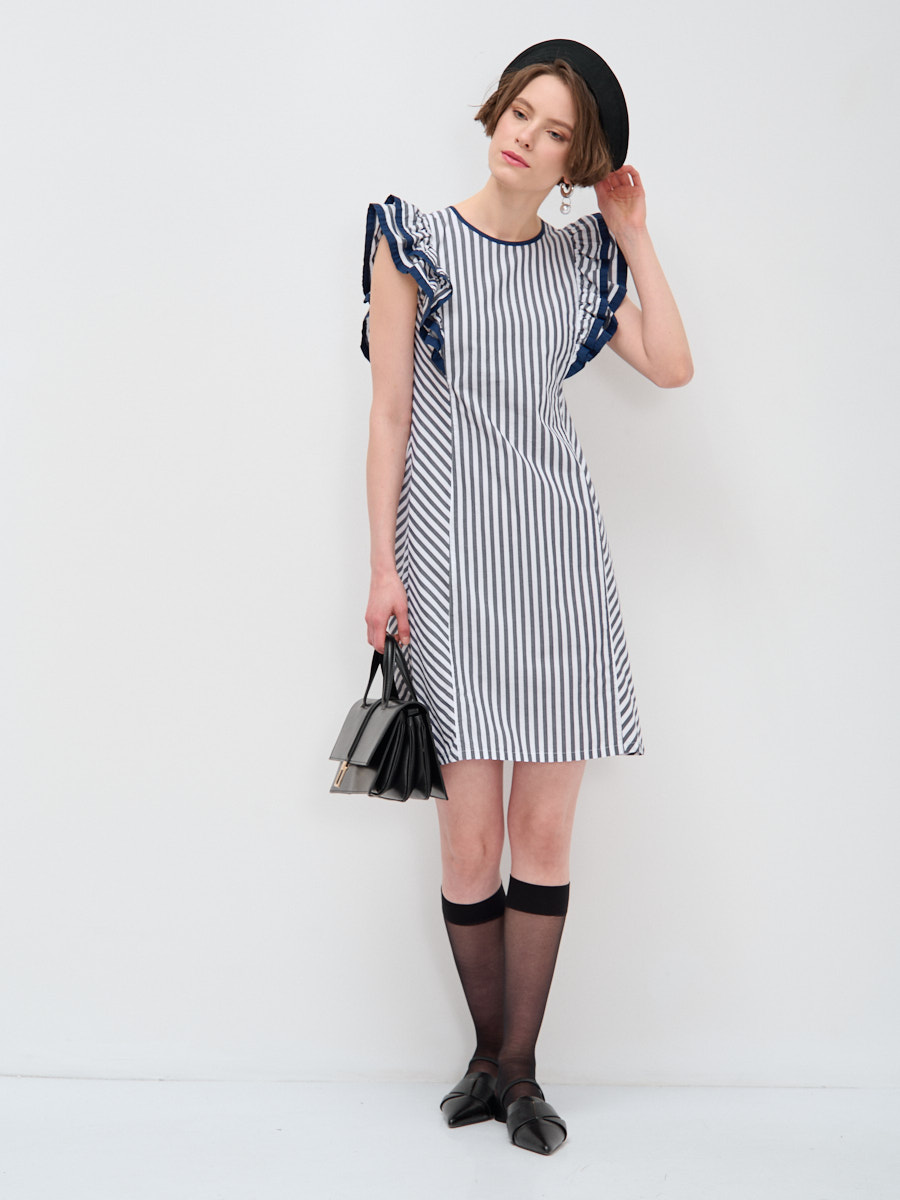 Увеличьте прибыль вашего бутика с элегантным платьем-трапецией от TANTINO! Представляем модель, которая идеально сочетает в себе комфорт повседневной одежды и изысканный дизайн, созданный для привлечения внимания ваших покупателей.Это повседневное платье трапециевидного силуэта выполнено с использованием сложных конструкторских решений, таких как отрезной бочок, который обеспечивает идеальную посадку по фигуре и деликатно подчеркивает силуэт. Актуальный полосатый принт в сине-белой гамме придает изделию свежий и современный вид, а его диагональное расположение на подоле визуально вытягивает фигуру и добавляет динамики.Особое внимание привлекает двухслойный рукав «крыло» с изящными воланами. Его края и горловина обработаны декоративной косой бейкой в тон, что свидетельствует о высоком качестве пошива и внимании к деталям – характерной черте продукции TANTINO. Модель универсальна и легко впишется в гардероб современной женщины, ценящей стиль и удобство.Почему стоит выбрать эту модель для вашего ассортимента:Актуальный дизайн: Модный полосатый принт и оригинальный крой.Идеальная посадка: Трапециевидный силуэт и отрезной бочок.Высокое качество пошива: Декоративная отделка и проработка деталей.Универсальность: Подходит для различных повседневных образов.Легкость в уходе: Рекомендуется деликатная машинная стирка.Предлагайте своим клиентам эксклюзивные модели, созданные TANTINO — от разработки лекал до финального шва. Гарантируем стабильный спрос и удовлетворенность ваших покупателей.