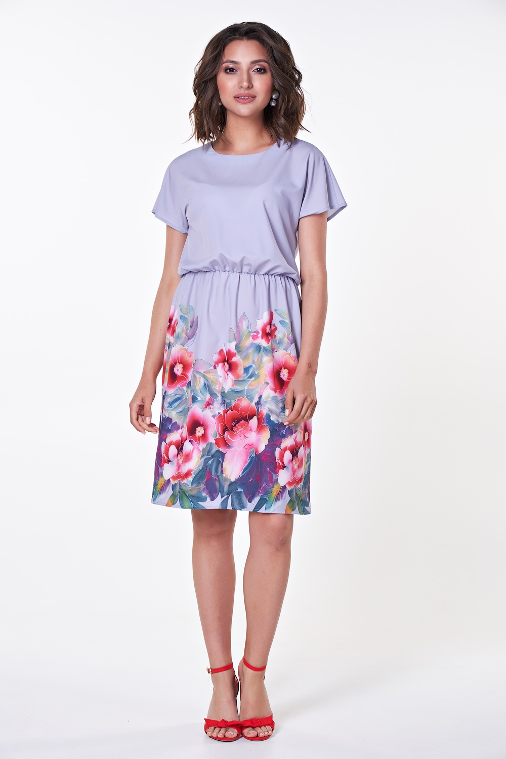 Комфортное платье полуприлегающего силуэта из легкой ткани с цветочным принтом. Короткие спущенные рукава. Горловина на обтачке оформлена "лодочкой". Модель отрезная по талии, собрана на резинку. В среднем шве спинки расположена застежка на молнию. Низ ровный, без разрезов. Итальянский принт.