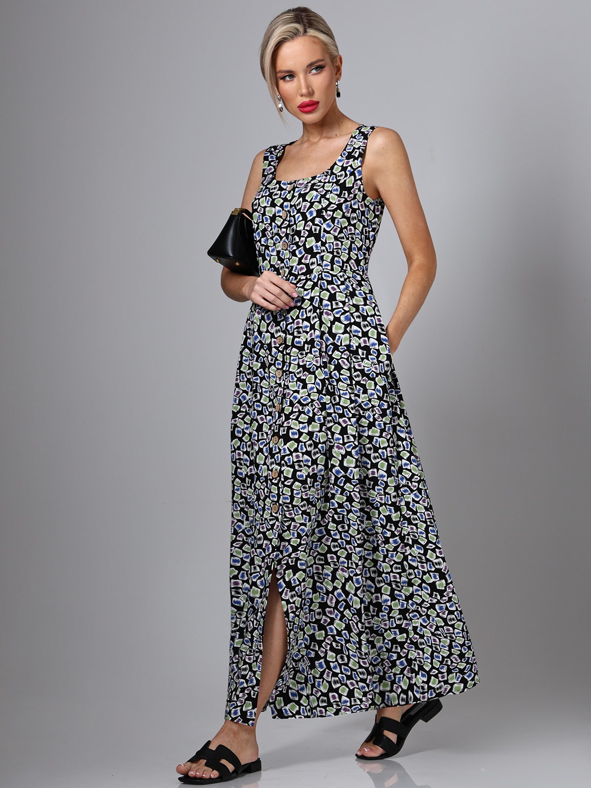 Длинное платье-сарафан с цветочным принтом выполнено из вискозы, что обеспечивает легкость, комфорт и приятные тактильные ощущения. Модель подходит для повседневной носки и представлена в больших размерах, что делает ее универсальным выбором для разных типов фигур. Платье имеет вырез горловины "каре", который добавляет образу элегантности. А карманы и пуговицы делают сарафан практичным. Платье выполнено без рукавов, что делает его удобным для теплой погоды. Уход за платьем требует бережной стирки при температуре 30 градусов, что помогает сохранить качество ткани, форму и яркость цветочного принта. Длинный крой платья создает женственный силуэт, подходящий для прогулок, отдыха или повседневных выходов. Цветочный принт добавляет образу легкости и свежести, а вискоза обеспечивает комфорт даже при длительной носке. Платье-сарафан сочетается с легкой обувью и аксессуарами, подчеркивая летний стиль.