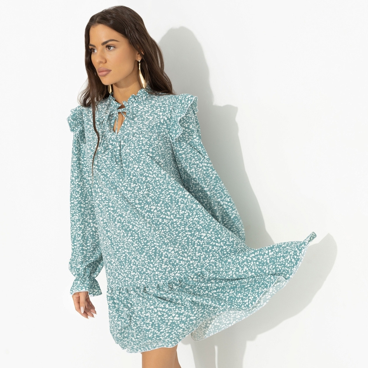 Настроение дня – надеть платье CHARUTTI. Несмотря на то, что сегодня нужно съездить в автосервис и отвезти ребенка на спортивную секцию. Любые дела приятнее делать, когда ты роскошна. Платье в длине до колена. Свободный силуэт изделия. Объемный декор в виде рюш на плечах и подоле изделия. Воротник-стойка дополнен завязками.